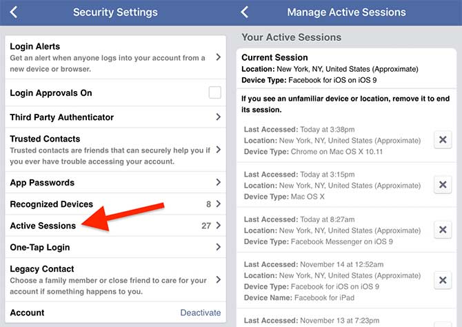 ១០)មើលគ្រប់ឧបករណ៍ទាំងអស់ដែលយើងបានបើគណនេយ្យ(Login) ហើយធ្វើការបញ្ឈប់ក៏បាន៖ ដើម្បីដំណើរការមុខងារនេះលោកអ្នកត្រូវចូលទៅកាន់ Setting → Account Settings → Security → Active Sessions ហើយចុចសញ្ញាខ្វែងសម្រាប់ការ Log out ពីឧបករណ៍នោះ។
