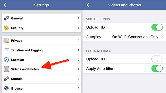 ៥)បិទមុខងារចាក់វីដេអូស្វ័យប្រវត្ត៖ ប្រសិនបើលោកអ្នកមិនចង់មើលវីដេអូដែលជាទូទៅវាចាក់ជាស្វ័យប្រវត្តក្នុងកម្មវិធី Facebook របស់អ្នក សូមលោកអ្នកចូលទៅកាន់ More → Setting → Account Settings → Videos and Photos → Autoplay លោកអ្នកអាចជ្រើសរើសមុខងារដែលមាន ប្រសិនបើលោកអ្នកជ្រើសយក Never Autoplay Videos នោះវានឹងលែងចាក់វីដេអូជាស្វ័យប្រវត្តទៀតហើយ។