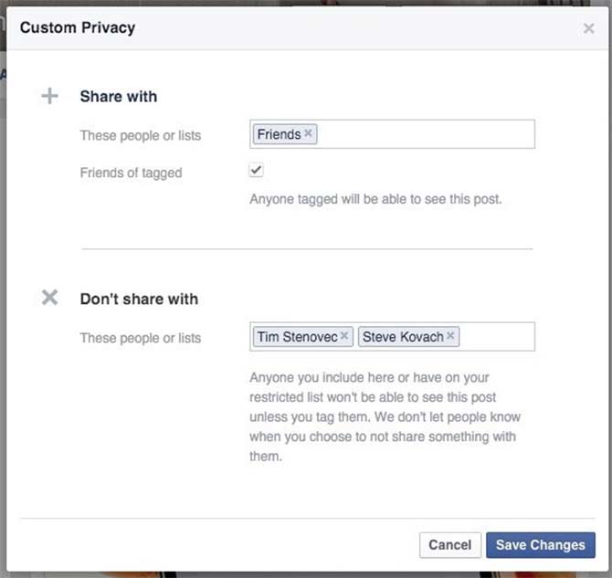 ៨)ពេលដែលលោកអ្នកចែកចាយអ្វីមួយ លោកអ្នកអាចកំណត់ពីមនុស្សណាដែលអ្នកមិនចង់អោយមើលឃើញ៖ លោកអ្នកអាចកំណត់អ្នកអាចមើល ឬមិនអាចមើលលើអ្វីដែលអ្នកចង់ចែករំលែកបានដោយគ្រាន់តែចុច Shared រួចជ្រើសយក Write Post នោះវានឹងបង្ហាញផ្ទាំងមួយថ្មី។ ត្រង់ចំនុចនេះលោកអ្នកត្រូវចុចលើពាក្យ Friend បន្ទាប់មកចូលពាក្យ Friends except... ហើយជ្រើសយកមិត្តភក្ដិណាដែលយើងមិនចង់អោយឃើញ។