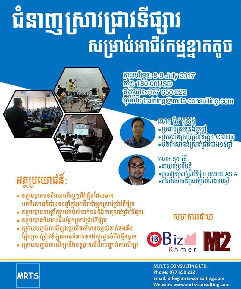 MRTS Consulting Ltd ក្រោមកិច្ចសហការពី BizKhmer និង M2 គ្រោងរៀបចំវគ្គសិក្សាពិសេសមួយ គឺ «ជំនាញស្រាវជ្រាវទីផ្សារសម្រាប់អាជីវកម្មខ្នាតតូច» នៅថ្ងៃទី៨ និងទី ៩ខែកក្កដា ឆ្នាំ២០១៧ ខាងមុខ ធ្វើឡើងដោយអ្នកជំនាញខាងផ្នែកស្រាវជ្រាវយូរឆ្នាំ។
