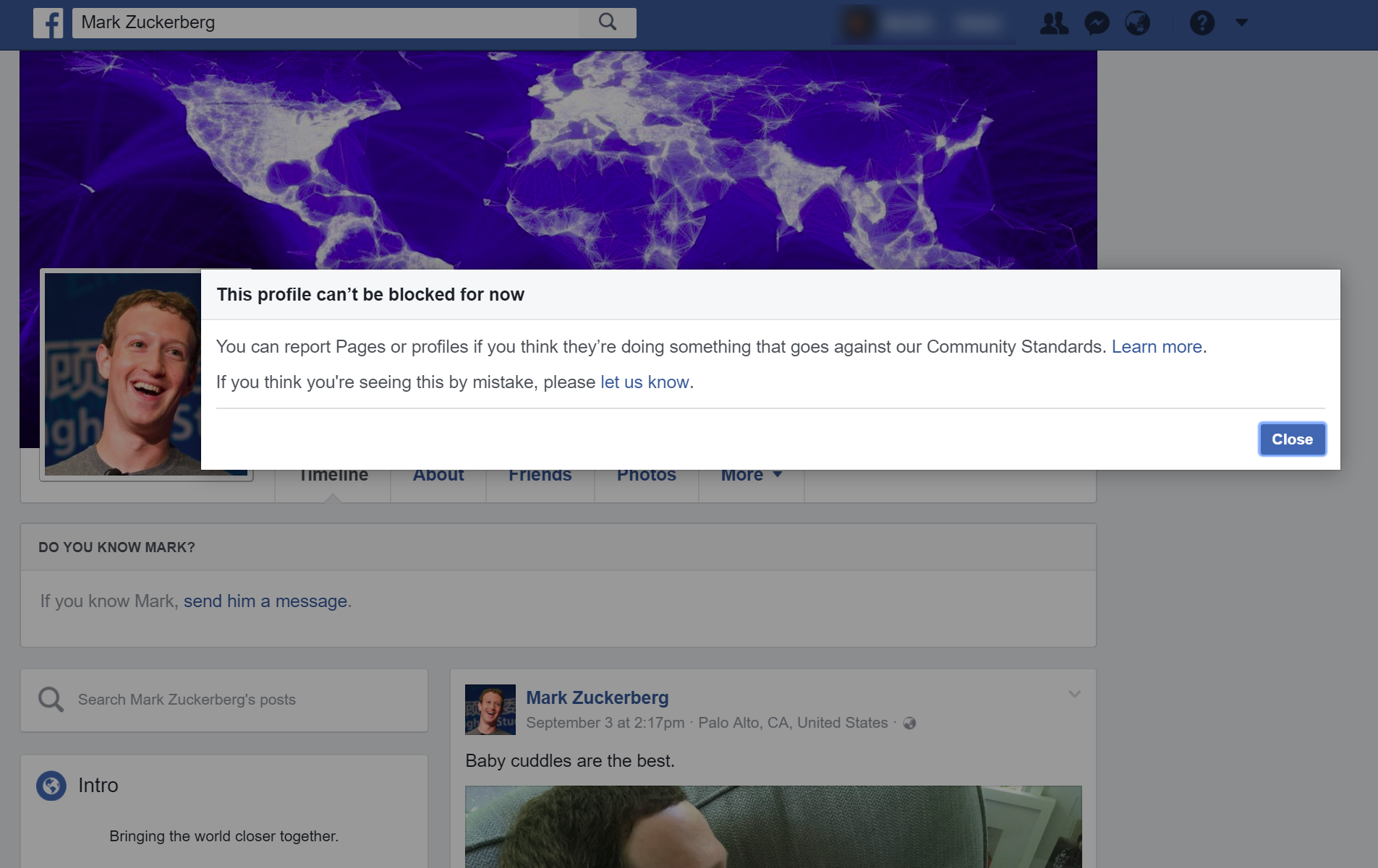 ប្រសិនអ្នកជានាយកប្រតិបត្តិក្រុមហ៊ុនបណ្ដាញសង្គមមួយ ដែលមានអ្នកប្រើប្រាស់ជាមធ្យមខ្ទង់ ២ពាន់លានគណនីវិញ តើអ្នកនឹងធ្វើអ្វីម្យ៉ាង ដើម្បីមិនឱ្យអ្នកណា អាចប្លុក (block) អ្នក និងភរិយារបស់អ្នកលើបណ្ដាញសង្គមរបស់ខ្លួន ឬទេ? នេះជា ការអះអាងពីអ្នកប្រើ Facebook មួយចំនួន ដែលសាកល្បងចូលទៅគណនីលោក Mark Zuckerberg និងភរិយារបស់លោក អ្នកស្រី Priscilla Chan គឺថា មុខងារ Block នេះមិនដំណើរការលើគណនីអ្នកទាំងពីរនោះឡើយ។