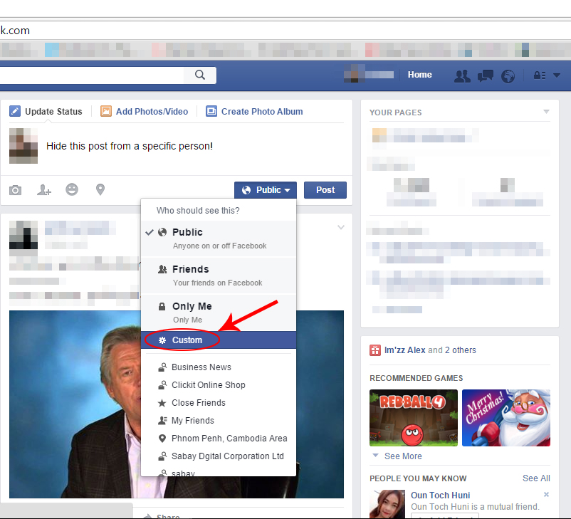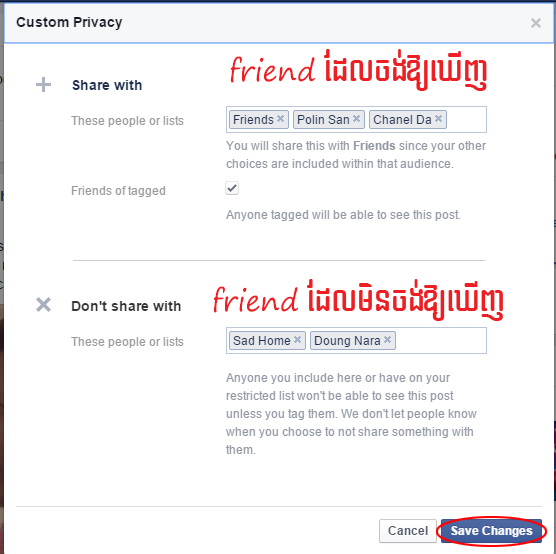 ១) នៅខាងក្រោមកន្លែងសរសេរ Status មានប្រអប់តូចមួយ (drop box) ដែលអ្នកអាចកំណត់ឱ្យនរណាខ្លះអាចមើលឃើញ Post របស់អ្នកបាន ហើយក៏អាចកំណត់មិនឱ្យគេមើលឃើញបានផងដែរ (Who should see this?)។ ក្រោយពីសរសេរ Status រួច គ្រាន់តែចុចលើប្រអប់តូច (drop box) នោះ (ជាធម្មតាកំណត់យក Public ស្រាប់នោះ) ប្ដូរទៅជា Custom វិញ។ សូមចុចលើ More Options រួចហើយ អ្នកនឹងឃើញពាក្យ Custom នៅពីក្រោម Only Me។