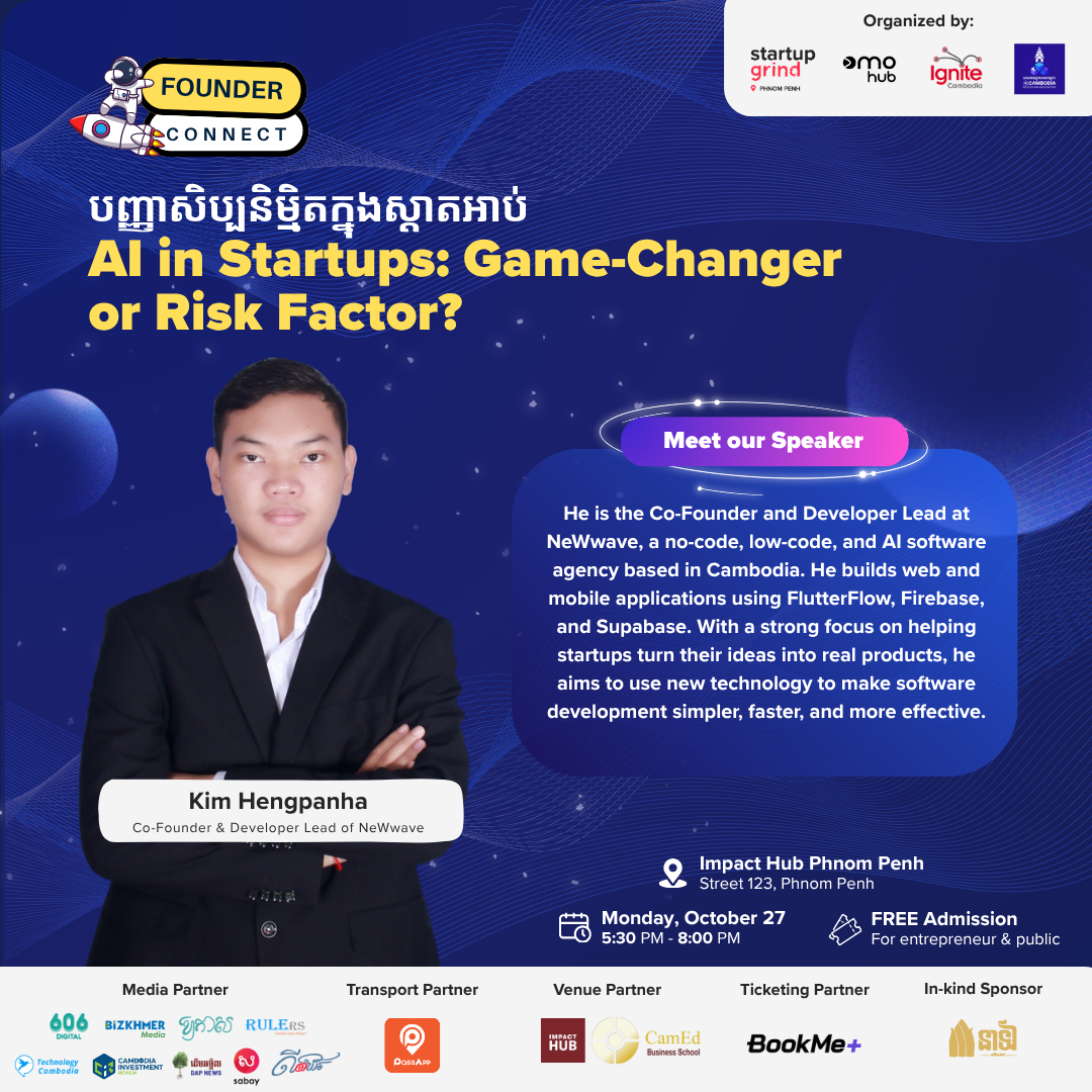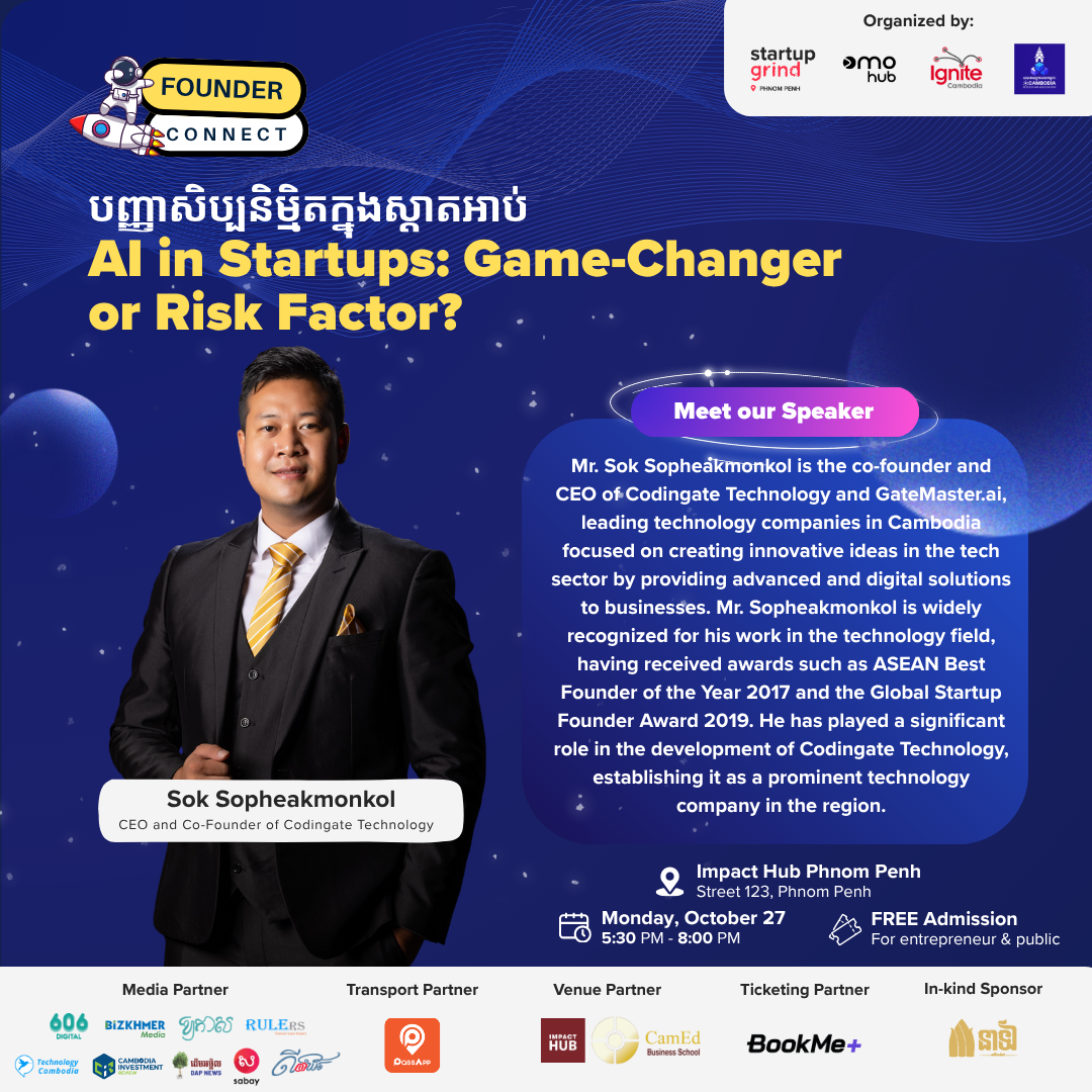 ភ្នំពេញ – Startup Grind Cambodia មានសេចក្តីសោមនស្សរីករាយក្នុងការរៀបចំកម្មវិធី Founder Connect នាពេលខាងមុខនេះក្រោមប្រធានបទ “AI in Startups: Game-Changer or Risk Factor?” ដែលនឹងប្រព្រឹត្តទៅនៅថ្ងៃច័ន្ទ ទី 27 ខែតុលា ឆ្នាំ 2025 ពីម៉ោង 5:30 PM ដល់ 8:00 PM នៅ Impact Hub Phnom Penh។