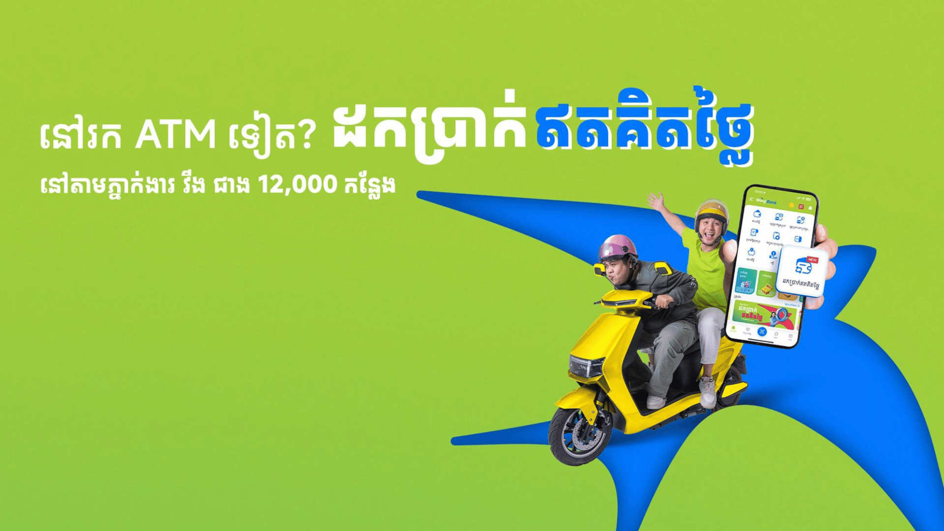 ជាមួយនឹងបណ្តាញភ្នាក់ងារធនាគារ វីង ជាង ១២,០០០ កន្លែង លោកអ្នកអាច ស្កេនដកប្រាក់បានគ្រប់ពេលវេលា ដោយគ្មានកំណត់ចំនួនទឹកប្រាក់ និងគ្មានគិតថ្លៃសេវា ដោយគ្រាន់តែប្រើប្រាស់នូវអេប Wing Bank របស់អ្នកដើម្បីស្កេន ប៉ុណ្ណោះ!