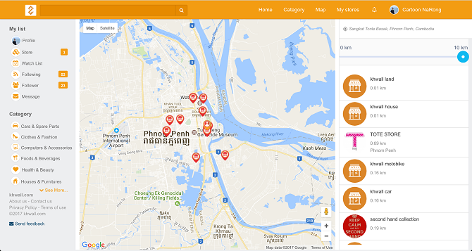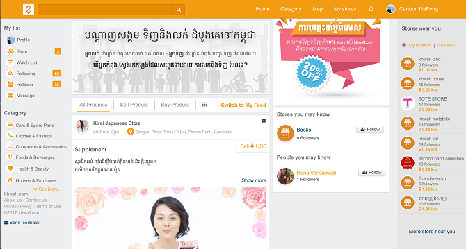 www.khwall.com ដែលជាបណ្ដាញសង្គមទីផ្សារ (social marketplace) ថ្មីមួយ សម្រាប់ប្រជាជនកម្ពុជា ដើម្បីធ្វើការទិញនិងលក់ទំនិញឬសេវាកម្មដ៏មានប្រសិទ្ធភាព។ អ្នកលក់អាចបង្កើតហាងបានដោយខ្លួនឯងដោយសេរី គ្រាន់តែបំពេញព័ត៌មានមួយ ចំនួនប៉ុណ្ណោះ។
