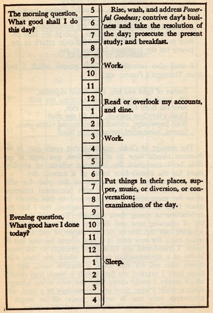 ១) កុំបញ្ឈប់ការសិក្សារៀនសូត្រឲ្យសោះ៖ នៅក្នុងតារាងកាលវិភាគប្រចាំថ្ងៃរបស់លោកខាងក្រោមនេះ អ្នកនឹងសង្កេតឃើញថាលោក ហ្វ្រេនឃ្លីន គឺជាបុគ្គលមួយរូបដែលបានបង្រៀនយើងឲ្យស្គាល់នូវតម្លៃនៃពេលវេលា។ គាត់មានទំនួលខុសត្រូវលើការងាររាប់ជំពូក ប៉ុន្តែគាត់នៅតែអាចស្វែងរកពេលវេលាជារៀងរាល់ថ្ងៃដើម្បីដុសខាត់សំលៀងកាំបិតចំណេះដឹងរបស់ខ្លួនឲ្យមុតជានិច្ច។ គាត់ក៏បានឲ្យយើងរៀនសូត្រដឹងថា មនុស្សដែលខ្ជះខ្ជាយពេលវេលារបស់ពួកគេឥតប្រយោជន៍ មានន័យថាបុគ្គលនោះមិនទាន់រកឃើញពីតម្លៃនៅក្នុងជីវិតរបស់ពួកគេនោះឡើយ។