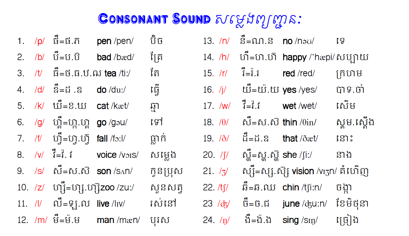 - រៀនអំពី ព្យញ្ជានៈទាំង២៤ (មានសម្លេងនិងអត់សម្លេង) និងព្យញ្ជនៈដទៃទៀត