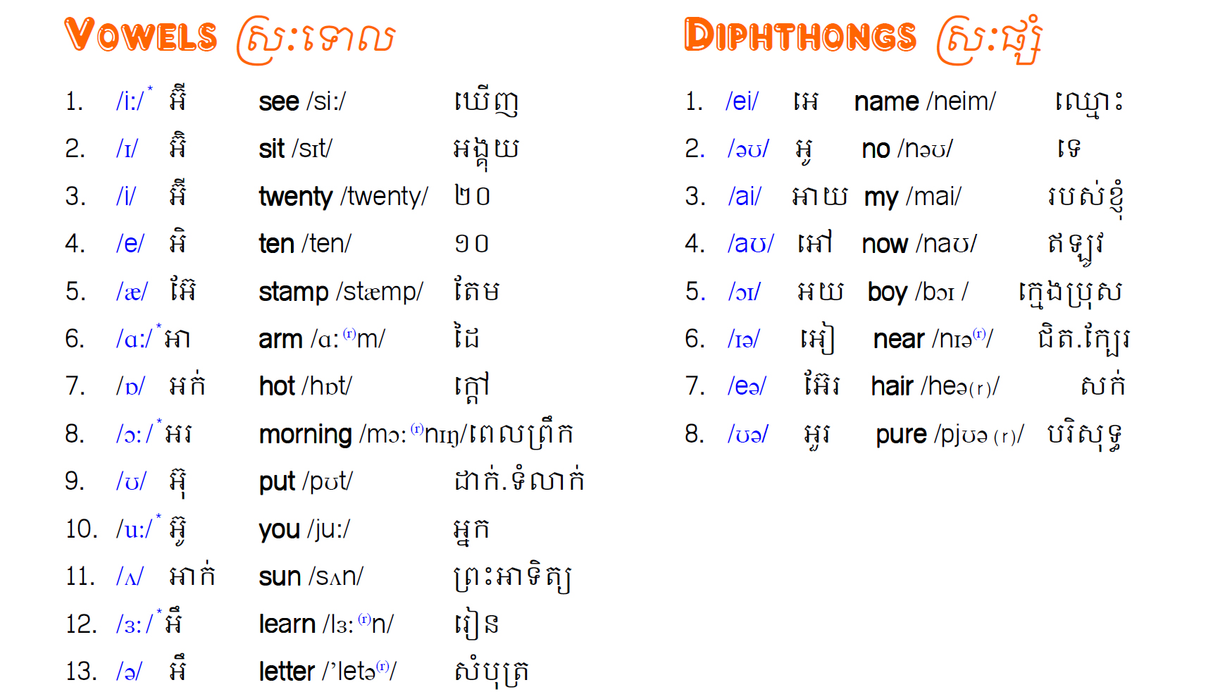 លោកអ្នកត្រូវចេះសម្លេងព្យញ្ជនៈទាំង ២៤តួ។ ដូចជាអក្សរ /p/ មានសម្លេង ផឹក អក្សរ/b/មានសម្លេង បឹ ឬ/t/ មានសម្លេង ធឹ ជាដើម។ ក្រៅពីព្យញ្ជនៈទាំងនោះ អ្នកក៏ត្រូវចេះស្រៈ (Vowels) ទាំង១៣ និងស្រះផ្សំ (diphthong) ទាំង ៨ផងដែរ និងដឹងថាសម្លេងស្រះណាវែងនិងខ្លីទៀតផង។ប្រសិនបើអ្នកចង់ដឹងកាន់តែលម្អិត អ្នកអាចស្វែងរកតាមយូធូប និងរៀនសម្លេងទាំងអស់នេះបន្ថែមទៀតពីព្រោះស្រៈនិងព្យញ្ជនៈទាំងនេះមានការបញ្ចេញសម្លេងដោយប្រើប្រាស់កាយវិការមាត់ខុសៗគ្នា។ ចំណាំ អ្នកត្រូវបញ្ចេញសម្លេងតាមព្យញ្ជនៈ និងស្រៈនីមួយៗឲ្យបានច្បាស់ ដោយលោកអ្នកអាចស្វែងរកវីដេអូតាមយូធូប បូកផ្សំនឹងតារាងអក្សរដែលមានការបញ្ចេញសម្លេងជាអក្សរខ្មែរស្រាប់ខាងលើជាជំនួយបន្ថែម។