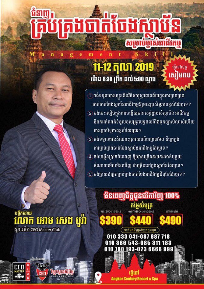 ពាក់ព័ន្ធនឹងការគ្រប់គ្រងនេះស្ថាបនិក CEO Master Club នៃវិទ្យាស្ថានស៊ីអ៊ីអូ និងជាអ្នកជំនាញបង្វឹកម្ចាស់អាជីវកម្មនៅទូទាំងប្រទេស ដែលមានបទពិសោធន៍ឆ្លងកាត់ព្យុះភ្លៀងយ៉ាងជោគជាំលើវិស័យធុរកិច្ច បានចែករំលែកនូវ រូបមន្តជោគជ័យក្នុងគ្រប់គ្រងចាត់ចែងស្ថាប័ន ដល់ម្ចាស់អាជីវកម្មខេត្តសៀមរាបចំនួន១០០នាក់ នៅក្នុងកម្មវិធីបង្វឹកស្តីពី ជំនាញគ្រប់គ្រងចាត់ចែងសម្រាប់ម្ចាស់អាជីវកម្ម ថ្ងៃទី១១-១២ តុលានេះដែលរៀបចំឡើងនៅសណ្ឋគារ Angkor Century Resort & Spa ក្រុងសៀមរាប។