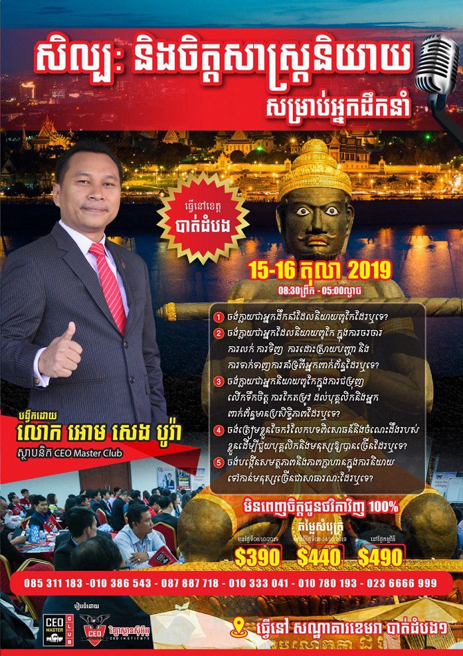ខេត្តបាត់ដំបង៖ សិល្បៈនិងចិត្តសាស្រ្ដនិយាយសម្រាប់អ្នកដឹកនាំ ដែលបង្វឹកដោយស្ថាបនិក CEO Master Club នៃវិទ្យាស្ថានស៊ីអ៊ីអូ និងជាអ្នកជំនាញបង្វឹកម្ចាស់អាជីវកម្មនៅទូទាំងប្រទេស ដែលមានបទពិសោធន៍ឆ្លងកាត់ព្យុះភ្លៀងយ៉ាងជោគជាំលើវិស័យធុរកិច្ចគឺ លោក អោម សេង បូរ៉ា នឹងដល់ទឹកដីជង្រុកស្រូវរបស់កម្ពុជា នៅសណ្ឋាគារខេមរា បាត់ដំបង១ ថ្ងៃទី១៥-១៦តុលាឆ្នាំ២០១៩ខាងមុខនេះ។