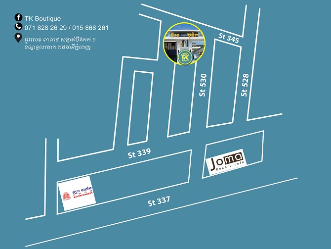 TK Boutique មានទីតាំងស្ថិតនៅផ្លូវលេខ៣៣៩ សង្កាត់បឹងកក់១ ខណ្ឌទួលគោក រាជធានីភ្នំពេញ។ សម្រាប់ព័ត៌មានលម្អិត សូមទាក់ទងទូរសព្ទលេខ ០៧១ ៨២៨ ២៦ ២៩, ០១៥ ៨៦៨ ២៦១ ។ ទីតាំង៖ https://goo.gl/maps/FTZQJeoBVxbSg5yo6