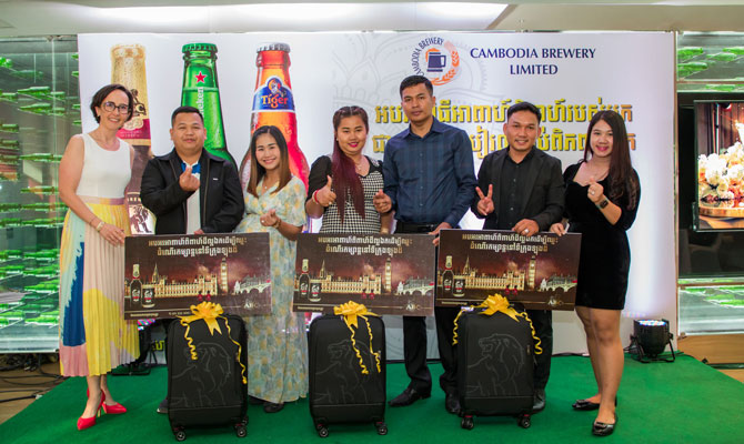 រាជធានីភ្នំពេញ៖ កាលពីថ្ងៃចន្ទទី ២ ខែធ្នូ ឆ្នាំ ២០១៩ នៅទីស្នាក់ការក្រុមហ៊ុនផលិតស្រាបៀរកម្ពុជា (CBL) ស្រាបៀរលំដាប់ពិភពលោក គឺស្លាកសញ្ញាស្រាបៀរ ABC Extra Stout, Heineken® និង Tiger បានរៀបចំកម្មវិធីប្រគល់រង្វាន់ផ្តាច់ព្រ័ត្រជូនដល់គូស្វាមីភរិយាថ្មីទាំង១៧គូ ដែលបានជាវស្រាបៀរសម្រាប់ពិធីអាពាហ៍ពិពាហ៍របស់ខ្លួន និងមានសំណាងឈ្នះដំណើរកម្សាន្តក្រេបចន្ទទឹកឃ្មុំ។ កម្មវិធីប្រគល់រង្វាន់នេះមានការអញ្ជើញចូលរួមពីថ្នាក់គ្រប់គ្រង និងបុគ្គលិកក្រុមហ៊ុនផលិតស្រាបៀរកម្ពុជា (CBL) ព្រមទាំងគូស្វាមីភរិយាថ្មីទាំង១៧គូ ភ្ញៀវកិត្តិយសនិងអ្នកសារព័ត៌មានជាច្រើន។