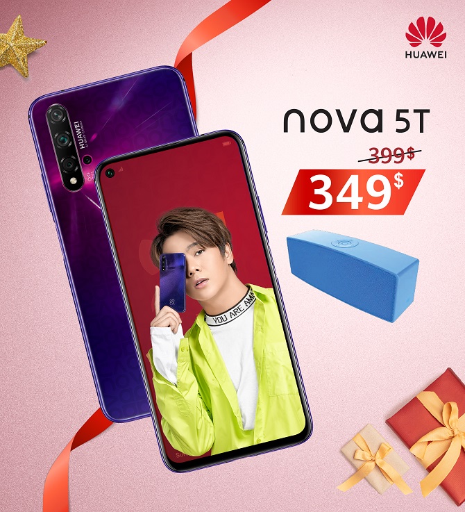 ២. Huawei Nova5T តម្លៃ 399$ តម្លៃថ្មីត្រឹមតែ 349$ ជាមួយកាដូ Bluetooth Speaker យ៉ាងស្រស់ស្អាត
