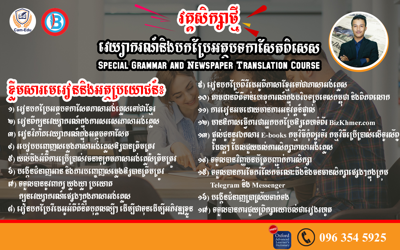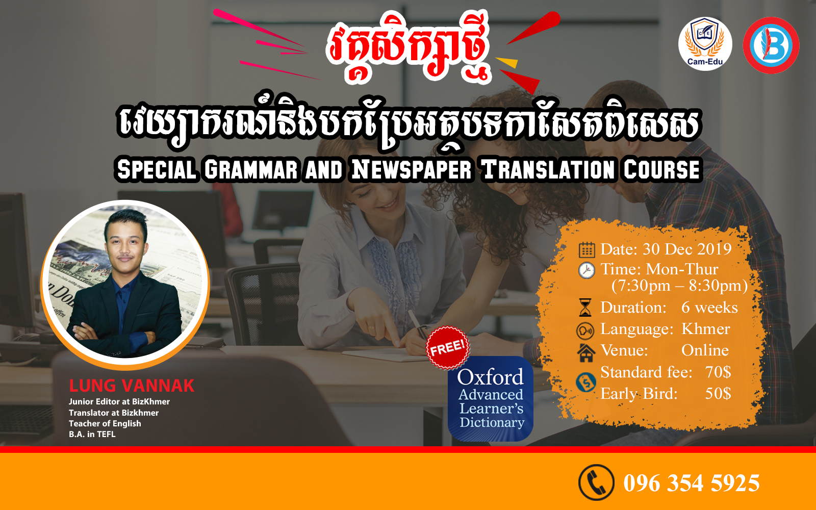 ? ? ? Special Grammar and Newspaper Translation Course is specifically designed by an expert, who has practical experiences in both teaching English and translating national and international news articles, for those who wish to widen and strengthen their English knowledge, especially grammar structures and translation. Besides, you will be able to know some techniques on how to pronounce English words correctly. In addition, the course will help you enrich your vocabulary, including words, phrases, phrasal verbs and idioms, for everyday use. Last but not least, you will be able to learn and know how to write Khmer into English with hand-on experience. Upon finishing this course, you will gain many benefits; moreover, translation skills are in demand.