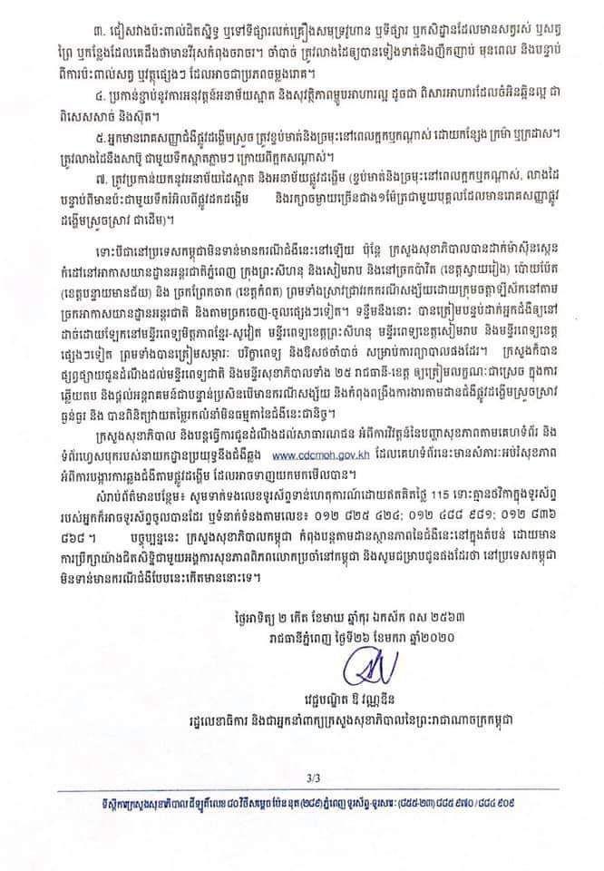 ក្នុងនោះដែរ ឯកឧត្តមសាស្រ្តាចារ្យ ម៉ម ប៊ុនហេង រដ្ឋមន្ត្រីក្រសួងសុខាភិបាល ក៏បានអំពាវនាវ ក្រើនរំឮកដល់សាធារណៈជនទាំងអស់ឲ្យមានការប្រុងប្រយ័ត្នខ្ពស់លើការបង្ការការចម្លងជំងឺរលាកសួតដោយវីរុសកូរ៉ូណាថ្មីនេះ និងត្រុវអនុវត្តនូវវិធានការណ៍ដូចខាងក្រោម៖