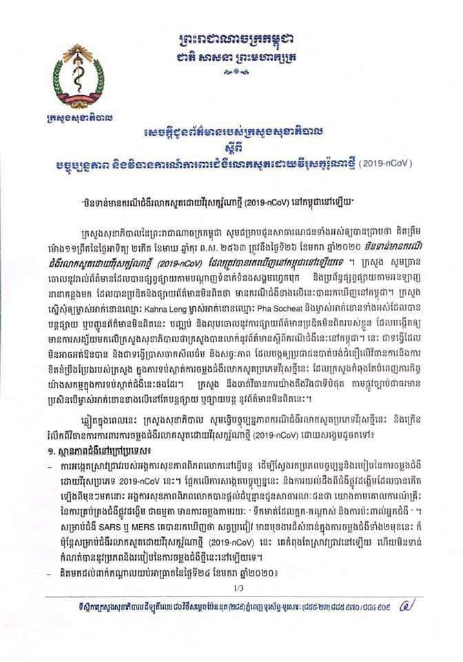 ស្របពេលជាមួយគ្នានេះដែរ ក្រសួងសុខាភិបាលនៃព្រះរាជាណាចក្រកម្ពុជាបានចេញសេចក្តីប្រកាសជាផ្លូវការមួយនៅម៉ោង ១១ ព្រឹកថ្ងៃអាទិត្យ ទី២៦ ខែមករា ឆ្នាំ២០២០ ផ្សាយនៅក្នុងទំព័រហ្វេសប៊ុកផ្លូវការរបស់ក្រសួងដែលបញ្ជាក់ថា ពុំមានករណីជំងឺរលាកសួតថ្មីកើតឡើងនៅព្រះរាជាណាចក្រកម្ពុជាឡើយ។ ក្រសួងបានធ្វើការច្រានចោលនៅរាល់ព័ត៌មានទាំងឡាយណា ដែលបានលើកឡើងថាមានករណីជំងឺនេះក្នុងប្រទេសកម្ពុជា។