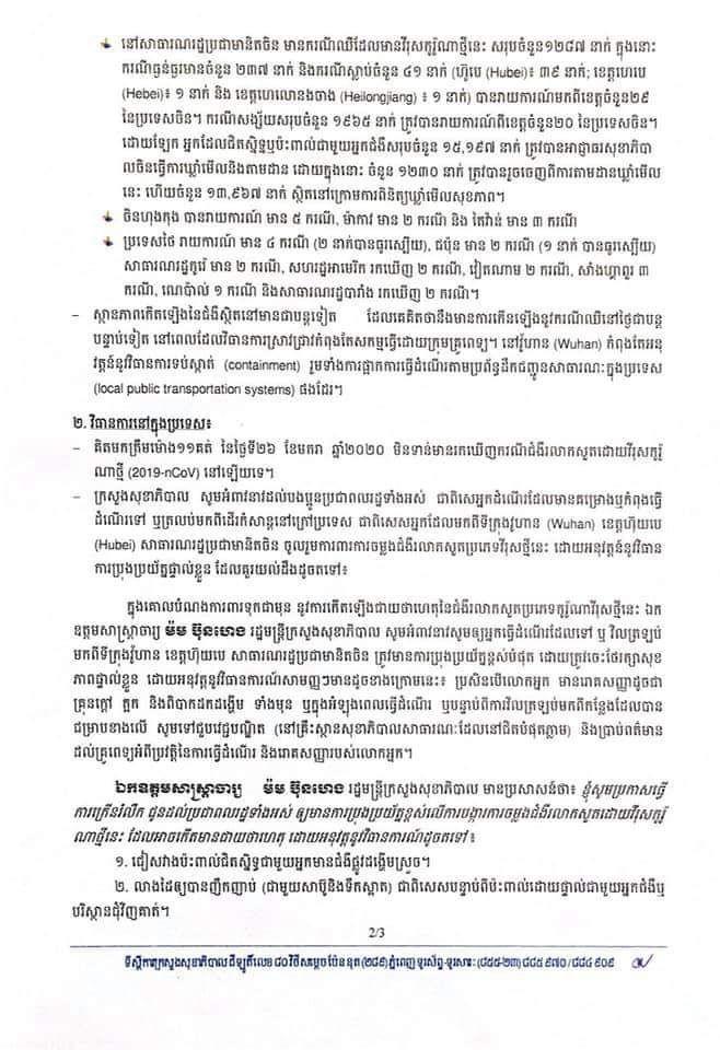 ក្នុងសេចក្តីប្រកាសនោះ ក្រសួងបានលើកឡើងចំៗថា៖ “ក្រសួង សូមច្រានចោលនូវរាល់ព័ត៌មានដែលបានផ្សព្វផ្សាយតាមបណ្ដាញទំនាក់ទំនងសង្គមហ្វេសប៊ុក និងប្រព័ន្ធផ្សព្វផ្សាយតាមអនឡាញនានាកន្លងមក ដែលបានប្រឌិតនិងផ្សាយព័ត៌មានមិនពិតថា មានករណីជំងឺចាងលើបានរកឃើញនៅក្នុងប្រទេសកម្ពុជា។ ក្រសួងស្នើសុំឲ្យម្ចាស់អាក់ខោនឈ្មោះ Khanha Leng ម្ចាស់អាក់ខោនឈ្មោះ Pha Shocheat និងម្ចាស់អាក់ខោនទាំងអស់ដែលបានបន្តផ្សាយ និងបញ្ជូនព័ត៌មានមិនពិតនេះ បញ្ឈប់ និងលុបចោលនូវការផ្សាយព័ត៌មានមិនពិតរបស់ខ្លួន ដែឡបង្កើតឲ្យមានការសង្ស័យមកលើក្រសួងសុខាភិបាល ថាក្រសួងបានលាក់បាំងនូវព័ត៌មានស្តីពីការកើតមានជំងឺនេះនៅកម្ពុជា។ នេះជាទង្វើមិនអាចអត់ឱនបាន និងជាទង្វើប្រាសចាកសីលធម៌ និងសច្ចៈភាព ដែលបង្កឲ្យប្រជាជនកម្ពុជាបាត់បង់ជំនឿលើការចាត់វិធានការនិងការខិតខំប្រឹងប្រែងរបស់ក្រសួង ក្នុងការទប់ស្កាត់ការចម្លងជំងឺរលាកសួតប្រភេទវីរុសថ្មីនេះ ដែលក្រសួងកំពុងបំពេញកាតព្វកិច្ចយ៉ាងសកម្មក្នុងការទប់ស្កាត់ជំងឺនេះផងដែរ។ ក្រសួង នឹងចាត់វិធានការយ៉ាងតឹងរ៉ឹងជាទីបំផុត តាមផ្លូវច្បាប់ជាធរមានប្រសិនបើម្ចាស់អាក់ខោនខាងលើនៅតែបន្តផ្សាយ ឬផ្សាយបន្តនូវព័ត៌មានមិនពិតនេះ”។