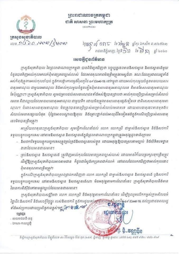 តាមការចេញផ្សាយពីសារព័ត៌មានក្នុងស្រុកមួយនៅ ថ្ងៃសុក្រទី ២០ មីនា នេះ សម្តេចក្រឡាហោម ស ខេង បានមានប្រសាសន៍ថា៖ “អ្នកដែលបន្តបំផុសព័ត៌មានប្រឌិតរឿង Covid 19 នឹងត្រូវទទួលខុសត្រូវចំពោះមុខច្បាប់”។