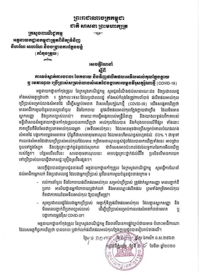 បែបនេះហើយ ទើប ក្រសួងសុខាភិបាល ចេញសេចក្តីប្រកាស ស្នើដល់ម្ចាស់ឱសថស្ថាន ឱសថស្ថានរងមួយចំនួនត្រូវទិញអាល់កុលដែលមានប្រភពច្បាស់លាស់ ប្រសិនបើក្រសួងសុខាភិបាលស្រាវជ្រាវរកឃើញថា ជាម្ចាស់ឱសថ ឱសថស្ថានរង ឬឱសថការី ទទួលបន្ទុកបច្ចេកទេស នៅតាមឱសថស្ថាន ឱសថស្ថានរង មិនអនុវត្តតាមការណែនាំរបស់ក្រសួងសុខាភិបាលទេ ក្រសួងសុខាភិបាល និងមានវិធានការតឹងរឹងតាមផ្លូវច្បាប់ដែលមានជាធរមាន ។