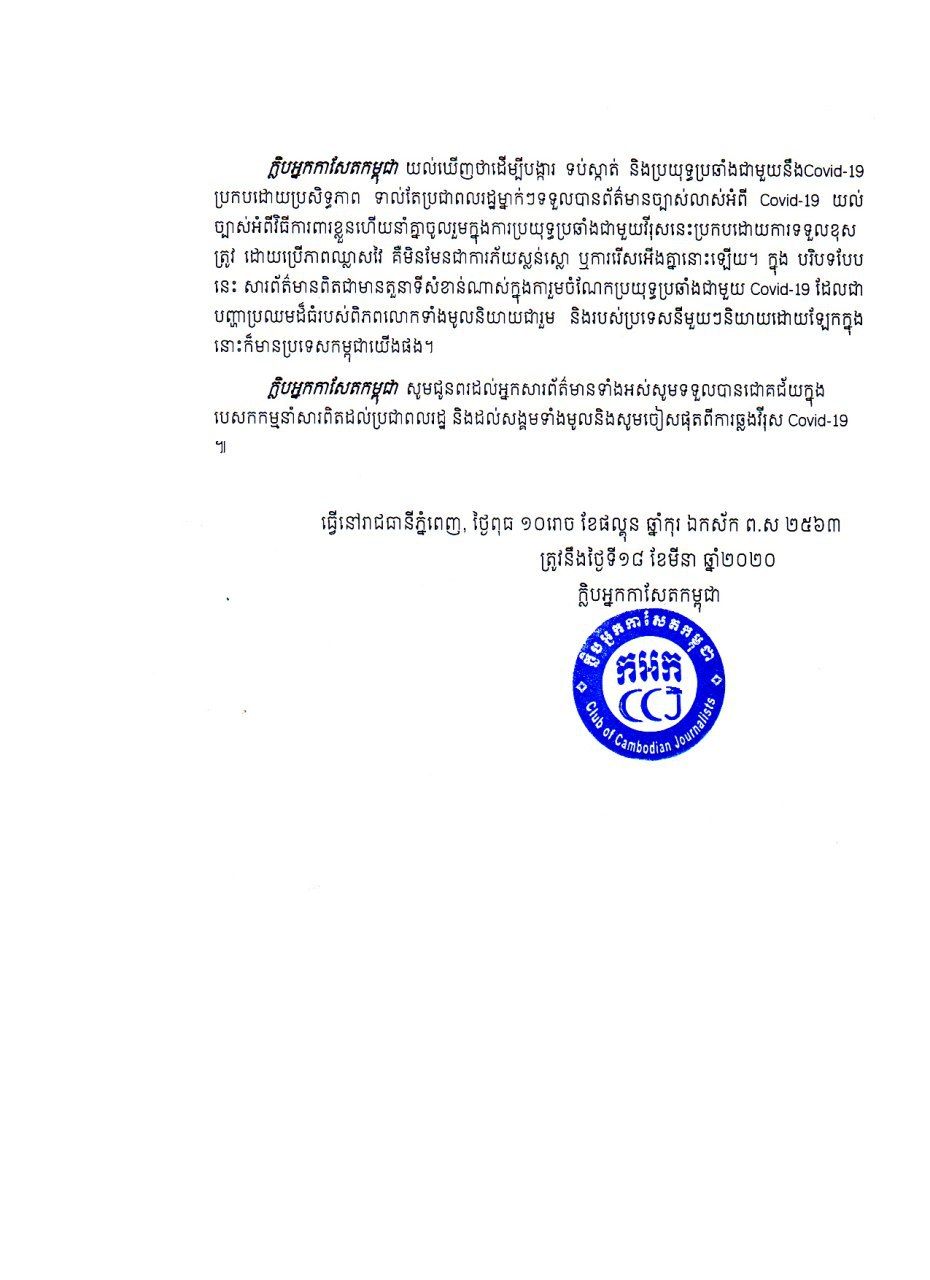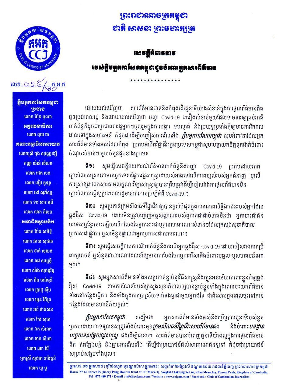 ជាមួយគ្នានេះដែរ ក្លឹបអ្នកសារព័ត៌មានកម្ពុជាក៏បានចេញសេចក្តីអំពាវនាវ ៤ ចំណុចសំខាន់ៗដល់អ្នកសារព័ត៌មានទាំងអស់ឲ្យធ្វើការចុះផ្សាយពាក់ព័ន្ធនឹងករណីកូវីដ ១៩ ដូចខាងក្រោម៖