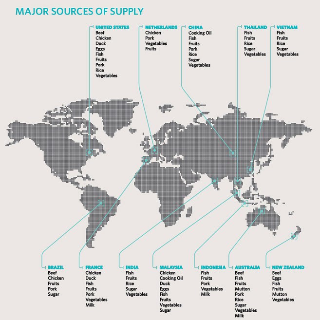 ក្រៅពីស៊ុត សិង្ហបុរីនាំចូលផលិតផលម្ហូបអាហារពីប្រទេសចំនួនជាង១៧០ ផ្សេងទៀត។