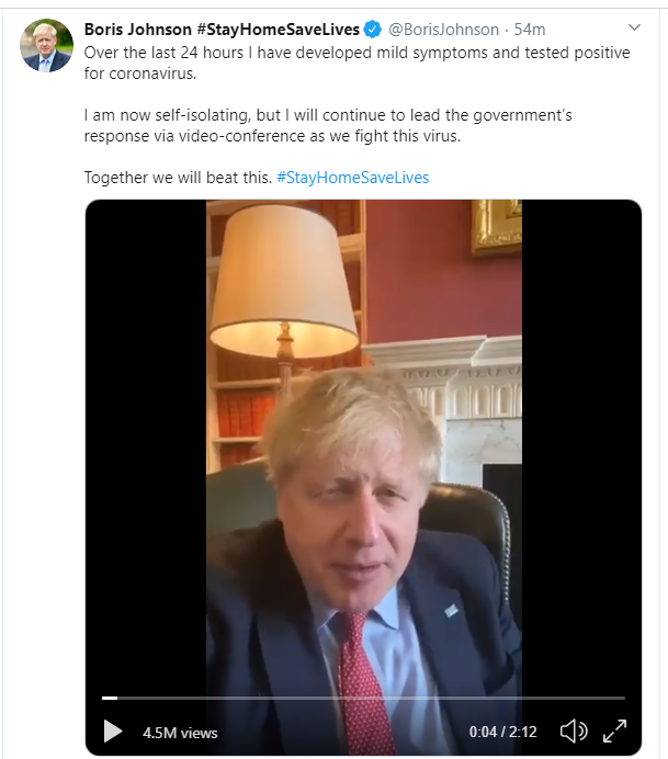 នាយករដ្ឋមន្រ្តីអង់គ្លេស Boris Johnson បានធ្វើតេស្តវិជ្ជមានជំងឺកូវីដ១៩។ នេះបើយោងតាមការបង្ហោះវីដេអូរបស់លោកលើបណ្ដាញសង្គម Twitter យកមកចុះផ្សាយដោយកាសែត kmov។