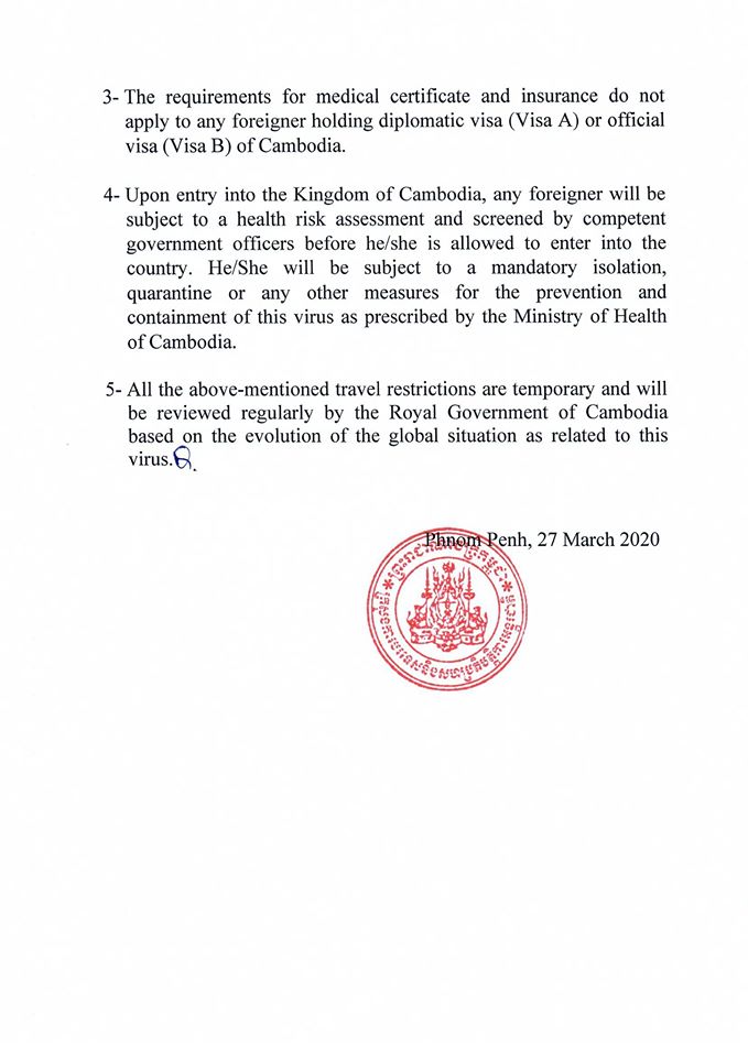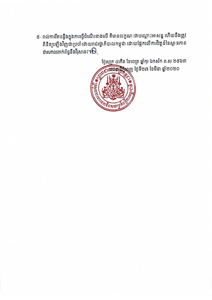 ៥៖ រាល់ការរឹតបន្តឹងក្នុងការធ្វើដំណើរខាងលើ គឺមានលក្ខណៈជាបណ្តោះអាសន្ន ហើយនឹងត្រូវ ពិនិត្យឡើងវិញជាប្រចាំដោយរាជរដ្ឋាភិបាលកម្ពុជា ដោយផ្អែកលើការវិវត្តន៍នៃស្ថានភាពជា សកលពាក់ព័ន្ធនឹងវីរុសនេះ។