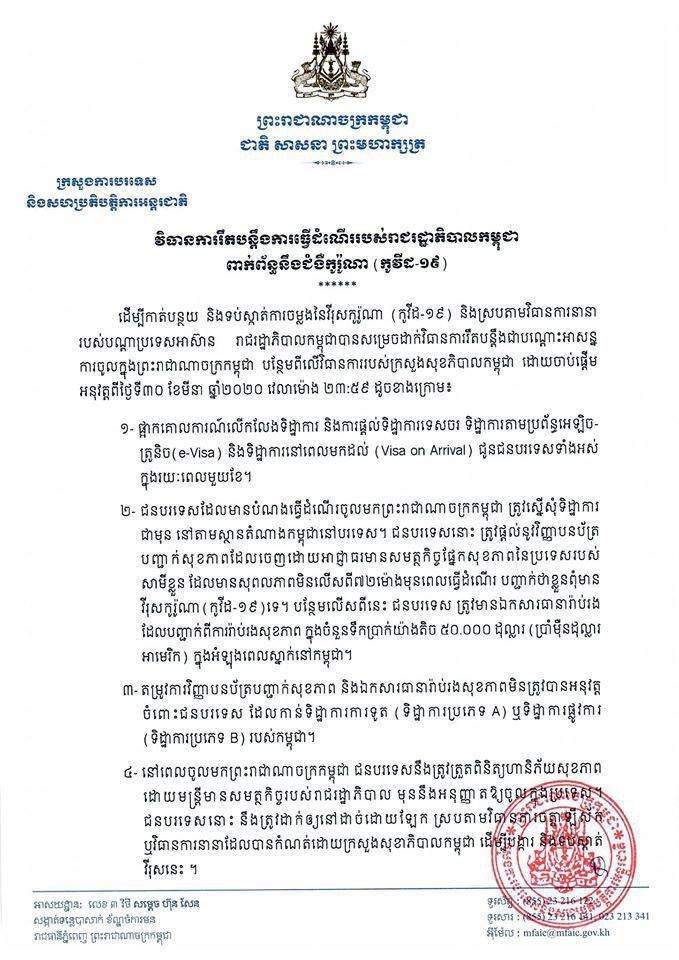 យោងតាមសេចក្តីប្រកាសចេញដោយក្រសួងការបរទេស និងសហប្រតិបត្តិការអន្តរជាតិ នៃព្រះរាជាណាចក្រកម្ពុជាបានកំណត់ថា វិធានការរបស់ក្រសួងទៅលើការរឹតបន្តឹងជាបណ្ដោះអាសន្ននូវការចូលព្រះរាជាណាចក្រកម្ពុជា នឹងចាប់អនុវត្តចាប់ពីថ្ងៃទី ៣០ ខែមីនាឆ្នាំ ២០២០ នៅវេលាម៉ោង ២៣:៥៩នាទី ដោយអនុវត្តនូវគោលការណ៍ទាំង ៥ ចំណុចខាងក្រោម៖