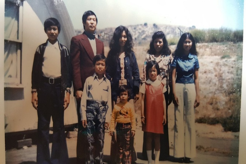 Ted Ngoy ជាមួយភរិយារបស់គាត់ឈ្មោះ Suganthini និងកូន ៗ បន្ទាប់ពីបានមកដល់សហរដ្ឋអាមេរិក។ រូបថត៖ Ted Ngoy