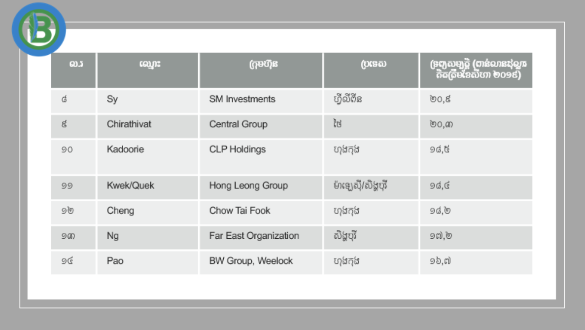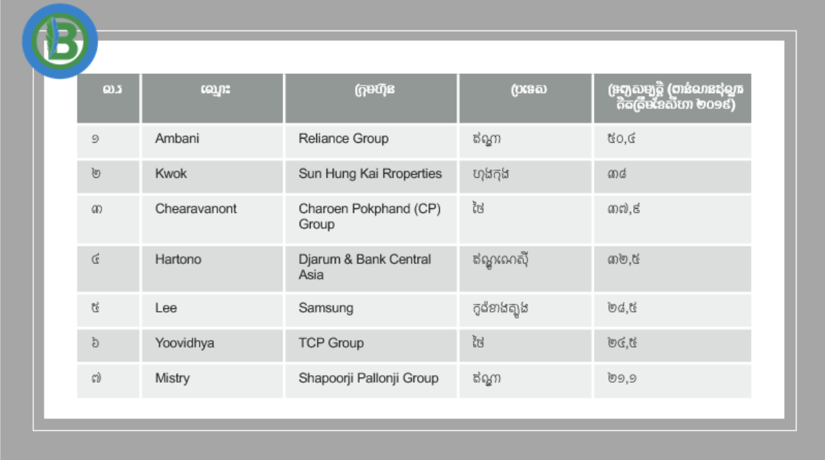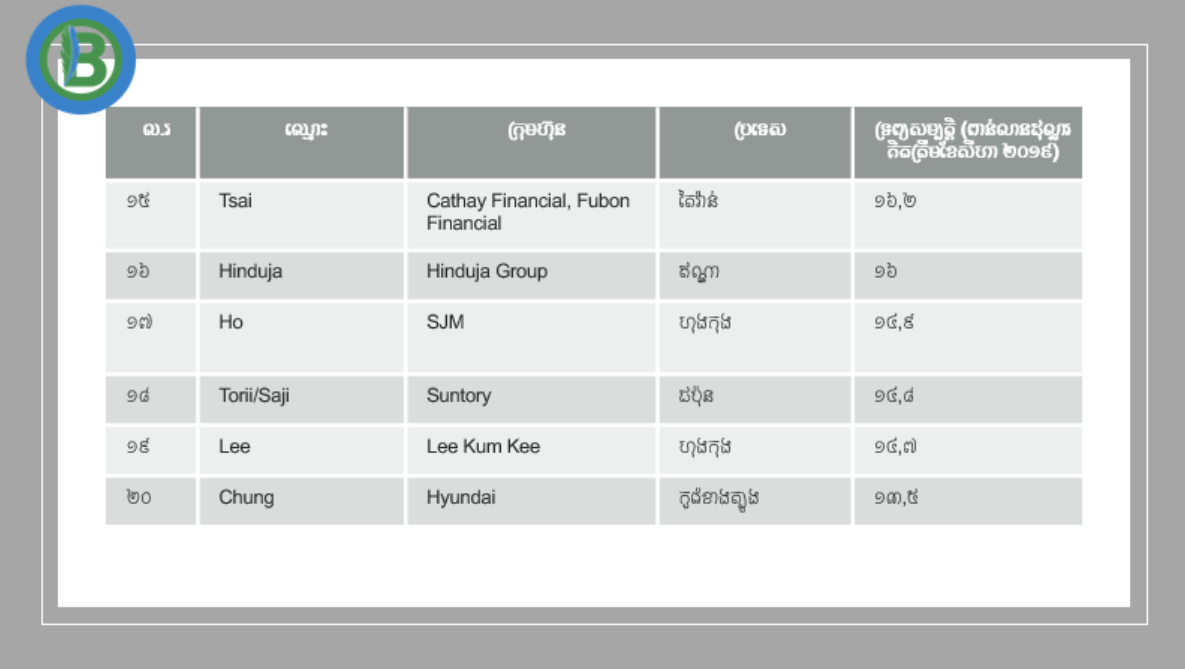 គ្រួសារអ្នកមានជាងគេ ២០នៅអាស៊ី ក្ដោបក្ដាប់ទ្រព្យសម្បត្តិ ៤៥០ពាន់លានដុល្លារ