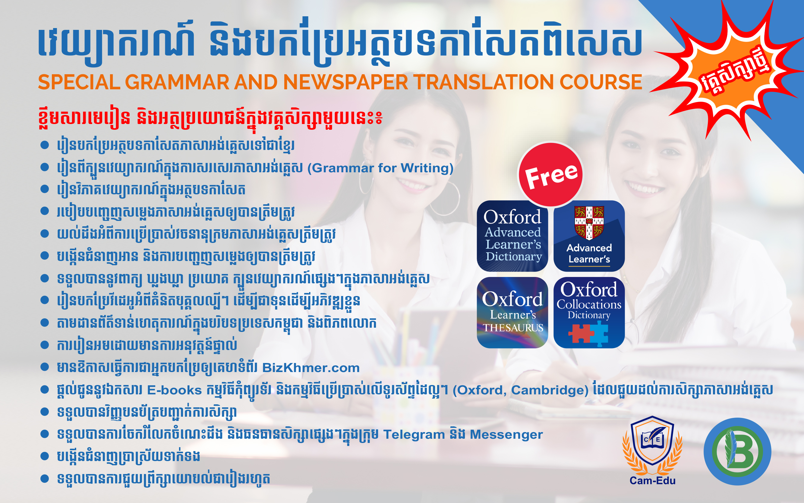 វគ្គសិក្សាពិសេស «វេយ្យាករណ៍និងបកប្រែកាសែត» គឺជាវគ្គសិក្សាដែលត្រូវបានរៀបចំឡើងយ៉ាងពិសេសដោយអ្នកជំនាញផ្នែកសារព័ត៌មានដែលមានបទពិសោធន៍យូរឆ្នាំក្នុងការបកប្រែអត្ថបទព័ត៌មានអន្តរជាតិនិងជាគ្រូបង្រៀនភាសាអង់គ្លេស សម្រាប់អ្នកសិក្សាដែលមានបំណងចង់ពង្រឹងនិងពង្រីកចំណេះដឹងផ្នែកភាសាអង់គ្លេសរបស់ខ្លួន ជាពិសេសវេយ្យាករណ៍និងការបកប្រែ។ បន្ថែមពីនេះក្នុងការសិក្សាវគ្គនេះ អ្នកនឹងទទួលបានរៀនពីការបញ្ចេញសម្លេងឲ្យត្រឹមត្រូវ និងបង្កើនសមត្ថភាពការអានរបស់អ្នក។ លើសពីនេះថែមទៀតនោះ អ្នកនឹងចេះនូវពាក្យ ឃ្លងឃ្លា ដែលប្រើប្រាស់ក្នុងបរិបទកាសែតតែម្ដង។ ក្រោយពីបញ្ចប់ការសិក្សា សិស្សនឹងទទួលបានអត្ថប្រយោជន៍ជាច្រើន ហើយជំនាញមួយនេះទៀតសោតក៏ជាជំនាញដែលកម្រនិងមានទីផ្សារកាងារទូលំទូលាយផងដែរ។
