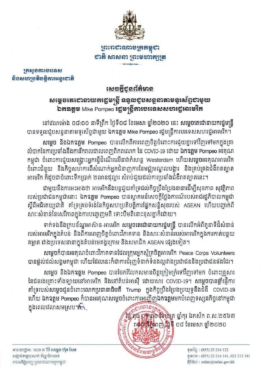 នៅព្រឹកថ្ងៃទី ០៨ ខែមេសាឆ្នាំ ២០២០ នេះ ប្រមុខរាជរដ្ឋាភិបាលកម្ពុជា សម្តេចតេជោនាយករដ្ឋមន្ត្រីបានទទួលជួបសន្ទនាតាមទូរស័ព្ទជាមួយឯកឧត្ដម Mike Pompeo រដ្ឋមន្ត្រីការបរទេសអាមេរិកដើម្បីលើកឡើងពីគោលជំហររបស់ប្រទេសទាំងពីរជុំវិញការវិវត្តចុងក្រោយនៃស្ថានភាពជំងឺកូវីដ ១៩ និងការទំនាក់ទំនងរបស់ប្រទេសទាំងពីរនៅក្នុងក្របខ័ណ្ឌក្នុងតំបន់។ នេះបើយោងតាមសេចក្ដីប្រកាសព័ត៌មានរបស់ក្រសួងការបរទេសកម្ពុជានាថ្ងៃទី៨ ខែមេសានេះ។