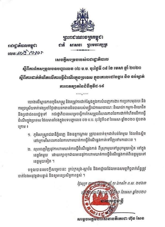 ក្រោយបានប្រកាសដាក់បទបញ្ជារឹតត្បិតហាមឃាត់ការធ្វើដំណើររបស់ប្រជាពលរដ្ឋដែលបានចូលជាធរមាននៅម៉ោង ២៤:០០ នាទីកាលពីយប់មិញ នៅថ្ងៃនេះរដ្ឋាភិបាលបានសម្រេចកែប្រែបទបញ្ជាថ្មីឡើងវិញហើយ។ ការកែប្រែនេះគឺធ្វើឡើងលើបទបញ្ជាចាស់លេខ ០២ ប.ប ចុះ ថ្ងៃទី ០៩ ខែមេសា ឆ្នាំ ២០២០ ស្តីពីការដាក់កំហិតលើការធ្វើដំណើរក្នុងប្រទេស ក្នុងគោលដៅបង្ការ និងទប់ស្កាត់ការរាតត្បាតជំងឺកូវីដ ១៩។