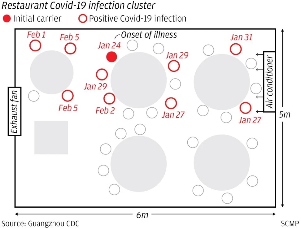 ដោយឡែក បើងាកទៅមើល The South China Morning Post ចុះផ្សាយកាលពីថ្ងៃទី១៥ មេសា ក៏បានដកស្រង់ការសិក្សាមួយយកមកចុះផ្សាយផងដែរ។ ១០ករណីដែលសិក្សាពីគ្រួសារចំនួន ៣ បានបង្ហាញថា ដំណក់តូចៗ ដែលចេញពីមាត់ តាមរយៈការក្អក ឬការកណ្ដាស់បង្កឱ្យមានការឆ្លងពិតមែន ហើយប្រសិនបើកម្លាំងខ្យល់ពីម៉ាស៊ីនត្រជាក់ខ្លាំង គឺច្បាស់ជាបង្កឱ្យមានការឆ្លងគ្នាពិតមែន។ ប្រភពដដែលក៏បានរៀបរាប់ផងដែរថា គ្រួសារទាំងបី គឺអង្គុយតុក្បែរគ្នាដែលម៉ាស៊ីនត្រជាក់បាញ់ចំច្រកខ្យល់តែមួយ (ដូចបង្ហាញក្នុងរូប) ដែលធ្វើឱ្យមានការឆ្លងគ្នាពិតប្រាកដ៕