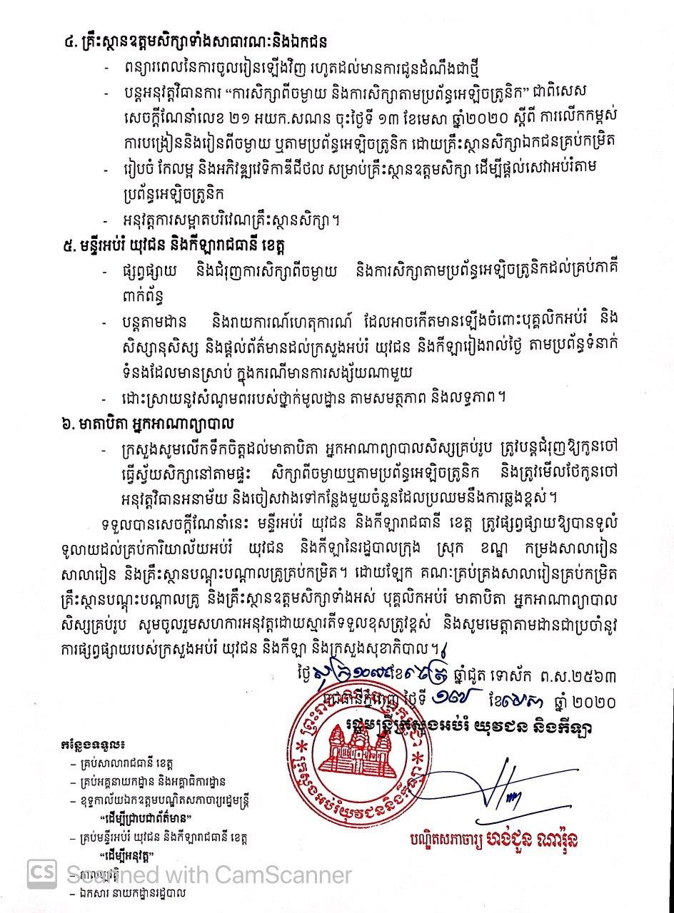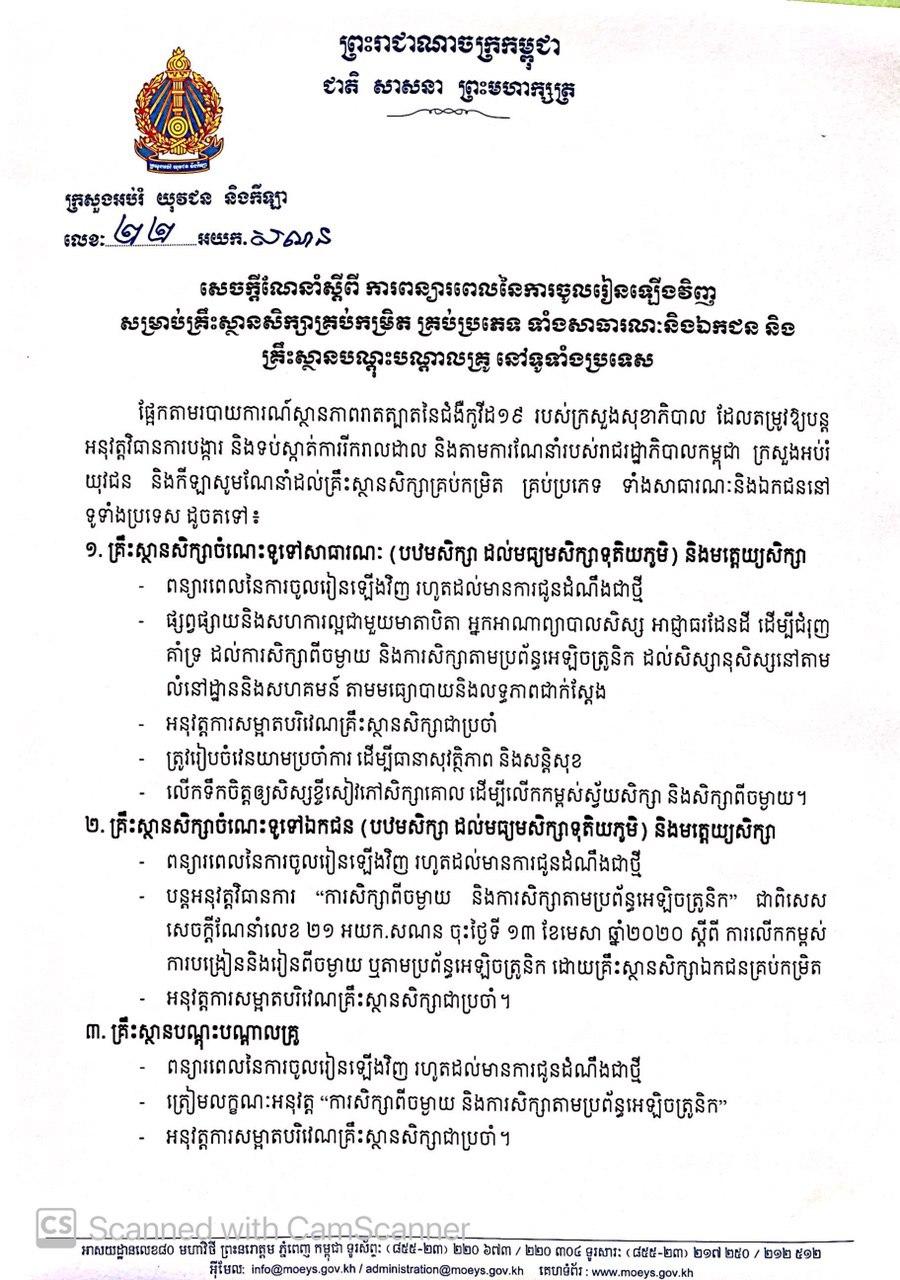 ក្រសួងអប់រំ យុវជន និងកីឡា បានប្រកាសពន្យារពេលនៃការចូលរៀនឡើងវិញ សម្រាប់គ្រឹះស្ថានសិក្សាគ្រប់កម្រិត គ្រប់ប្រភេទ ទាំងសាធារណៈ និងឯកជន និងគ្រឹះស្ថានបណ្ដុះបណ្ដាល គ្រូនៅទូទាំងប្រទេស ផ្អែកតាមរបាយការណ៍ស្ថានភាពរាតត្បាតនៃជំងឺកូវីដ១៩ របស់ក្រសួងសុខាភិបាល ដែលតម្រូវឱ្យបន្តអនុវត្តន៍ វិធានការបង្ការ និងទប់ស្កាត់ការរីករាលដាល និងតាមសេចក្ដីណែនាំរបស់ រាជរដ្ឋាភិបាលកម្ពុជា។