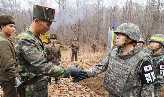 យោធាកូរ៉េខាងជើង (ឆ្វេង) ចាប់ដៃយោធាកូរ៉េខាងត្បូង (ស្តាំ) ប្រភពរូបភាព៖ ក្រសួងការពារជាតិកូរ៉េខាងត្បូង