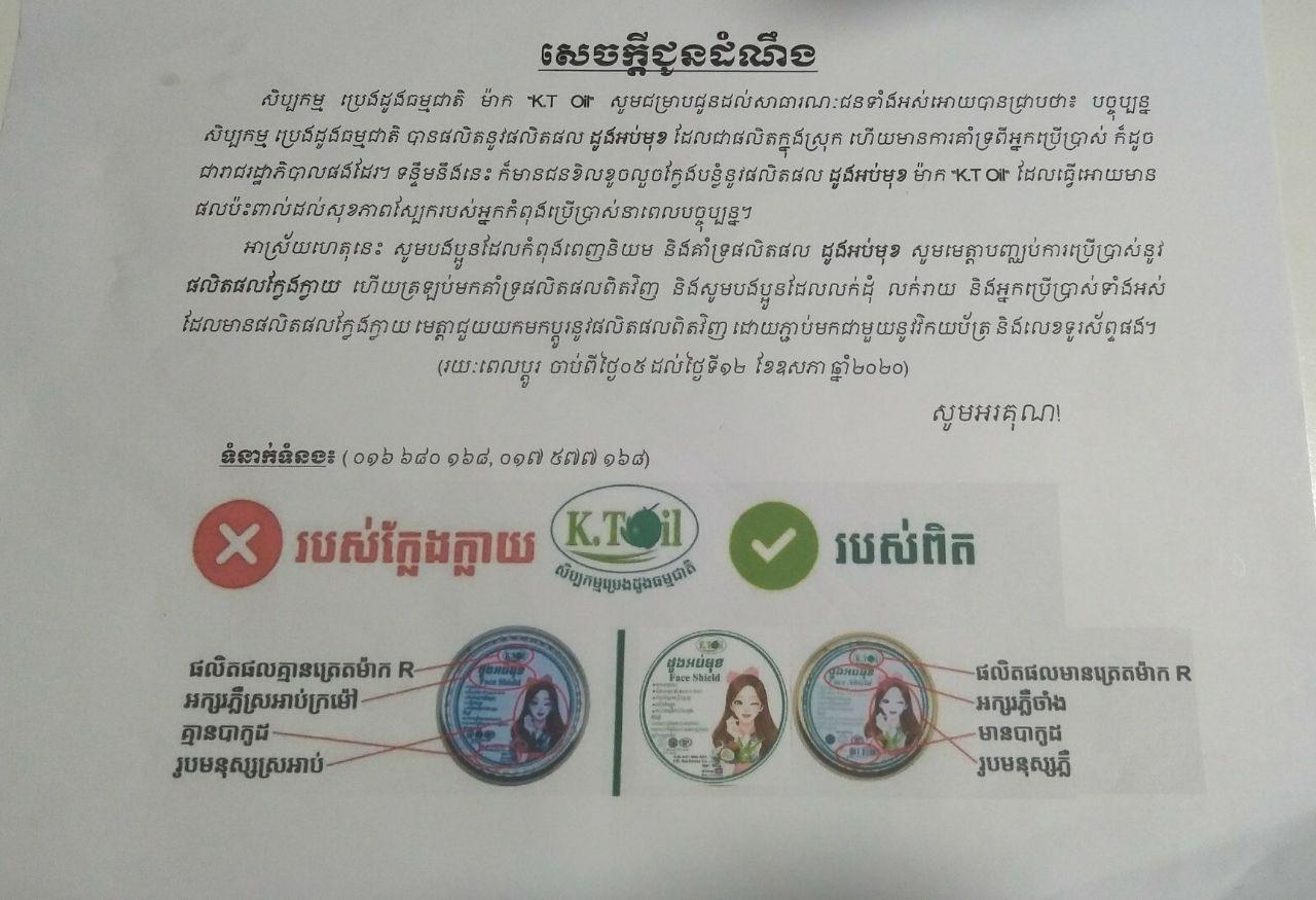 សូមបញ្ជាក់ថា យោងតាមសេចក្ដីជូនដំណឹងបានបញ្ជាក់ថា ផលិតផលម៉ាក K.T Oil មានជនខិលខូចក្លែងបន្លំនូវផលិតផល ដូងអប់មុខ ម៉ាកK.T Oil ដែលធ្វើឲ្យមានផលប៉ះពាល់ដល់សុខភាពស្បែករបស់អ្នកកំពុងប្រើប្រាស់នាពេលបច្ចុប្បន្ន។