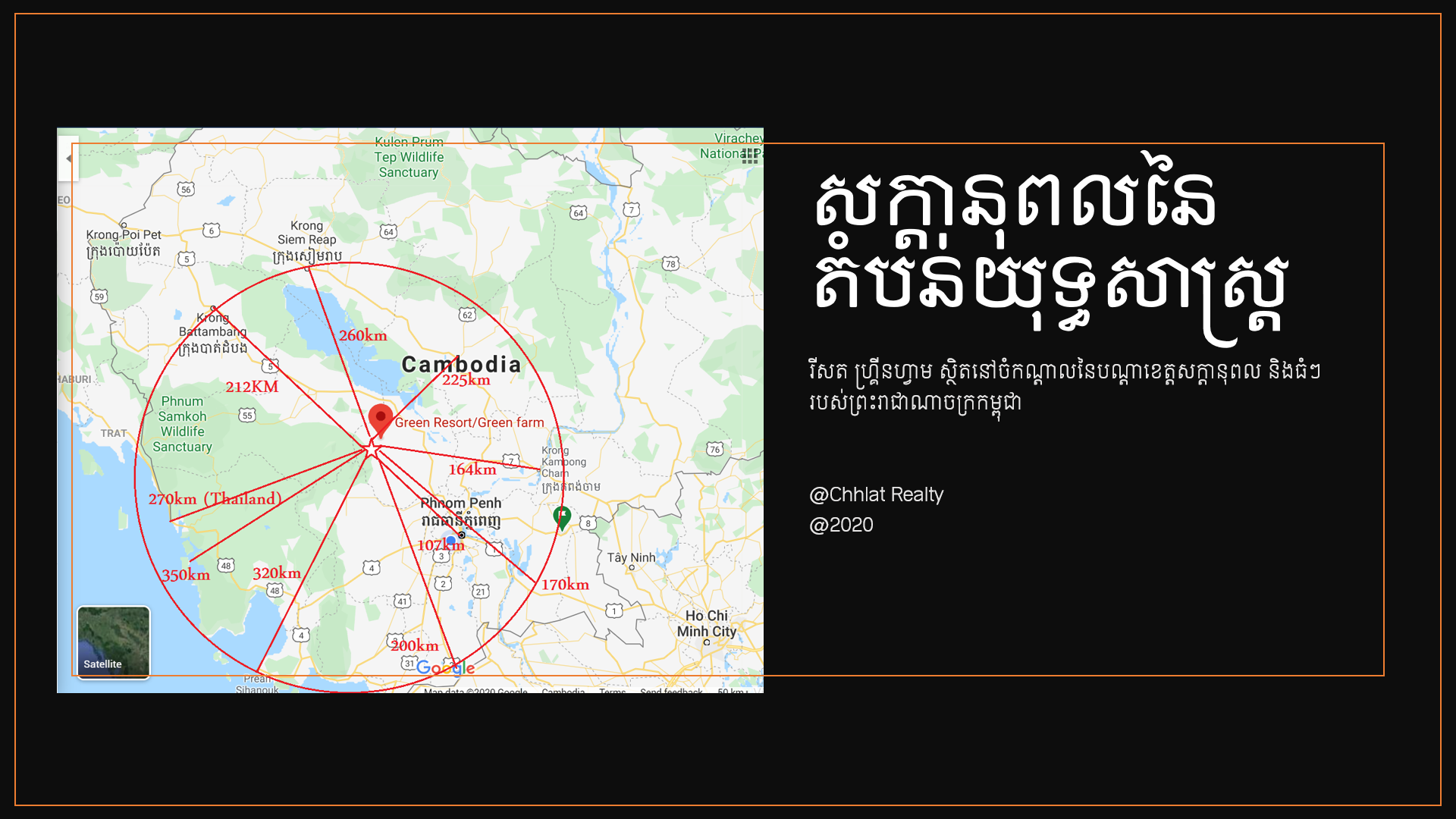 គម្រោងរបស់យើង មានទីតាំងស្ថិតនៅក្នុង ភូមិក្រាំងស្គារខាងត្បូង ឃុំក្រាំងស្គារ ស្រុកទឹកផុស ខេត្តកំពង់ឆ្នាំង ដែលមានចម្ងាយប្រមាណ ១០៤គីឡូម៉ែត្រប៉ុណ្ណោះពី វត្តភ្នំ ដែលជាចំណុចកណ្ដាលនៃរាជធានីភ្នំពេញ។ ជាគម្រោងអភិវឌ្ឍន៍មួយដែលទទួលបានការចាប់អារម្មណ៍យ៉ាងច្រើនពីសំណាក់ប្រជាពលរដ្ឋ និងអ្នកវិនិយោគពីគ្រប់មជ្ឈដ្ឋាន ព្រោះតំបន់នេះមានភាពអំណោយផលច្រើនពីធម្មជាតិ ពោលគឺព័ទ្ធទៅដោយតំបន់ទឹកធ្លាក់ចម្ងាយតិចជាង ៥០គីឡូម៉ែត្រ មានទឹកធ្លាក់ជ្រៀវ ទឹកធ្លាក់ស្រែអំពិល ទឹកធ្លាក់ច្រកល្អៀង និងជាពិសេសគៀកនឹងជើង ភ្នំឱរ៉ាល់ ដែលជាតំបន់ភ្នំខ្ពស់ជាងគេនៅកម្ពុជា។ បើនិយាយអំពី ហេដ្ឋារចនាសម្ព័ន្ធវិញ គឺរីសតរបស់យើងស្ថិតនៅប្របនឹងផ្លូវដែករបស់រដ្ឋ និងតាមបណ្ដោយផ្លូវ ៥៣B (រដ្ឋគ្រោងចាក់កៅស៊ូនាពេលឆាប់ៗនេះ) តភ្ជាប់ពីស្រុកទឹកផុស ខេត្តកំពង់ឆ្នាំង ទៅស្រុកក្រគរ ខេត្តពោធិ៍សាត់ ដែលបច្ចុប្បន្នជាផ្លូវគ្រួសក្រហមជិះបានដោយស្រួលសូម្បីរថយន្ត ទិកកូ ឬ Pruis ក៏ជិះទៅដល់ដោយសុវត្ថិភាពផងដែរ។ លក្ខខណ្ឌអាកាសធាតុអំណោយផលដល់ការដាំដុះ ដំណាំកសិកម្ម ការចិញ្ចឹមសត្វ និងការបង្កើតទៅជាកន្លែងកម្សាន្ត សម្រាកលំហែកាយ។