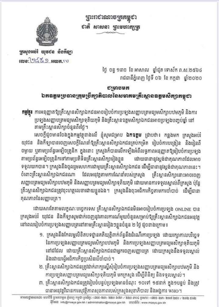 នៅក្នុងសេចក្តីប្រកាសរបស់ក្រសួងអប់រំយុវជននិងកីឡាលេខ ២៨៥១ អយក ចុះថ្ងៃទី ៦ ខែកក្កដា ឆ្នាំ ២០២០ បានសម្រេចថា អនុញ្ញាតឲ្យគ្រឹះស្ថានសិក្សាឯកជន រៀបចំការប្រលងសញ្ញាប័ត្រមធ្យមសិក្សាបឋមភូមិ និងការប្រឡងមធ្យមសិក្សាទុតិយភូមិ ដឹងគ្រឹះស្ថានឧត្តមសិក្សាឯកជនអាចប្រលងបញ្ចប់ឆ្នាំនៅតាមគ្រឹះស្ថានសិក្សាចំនួនពីរថ្ងៃ។