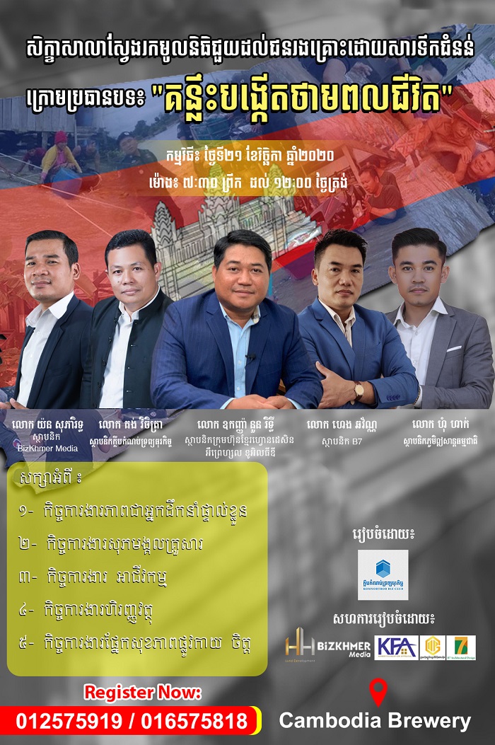 ក្លឹបកំណប់ទ្រព្យធុរកិច្ច ដោយចូលរួមសហការជាមួយដៃគូជាច្រើនទៀត រៀបចំសិក្ខាសាលាស្តីពី «គន្លឹះបង្កើនថាមពលជិវិត»។ កម្មវិធីនេះ រៀបចំឡើងក្នុងគោលបំណងរៃអង្គាសថវិកាជួយដល់ពលរដ្ឋរងគ្រោះដោយសារទឹកជំនន់ ដែលនឹងប្រព្រឹត្តទៅនៅថ្ងៃសៅរ៍ ទី២១ ខែវិច្ឆិកា ឆ្នាំ២០២០ វេលាម៉ោង ៧:៣០នាទី ដល់ម៉ោង ១២:០០នាទី។