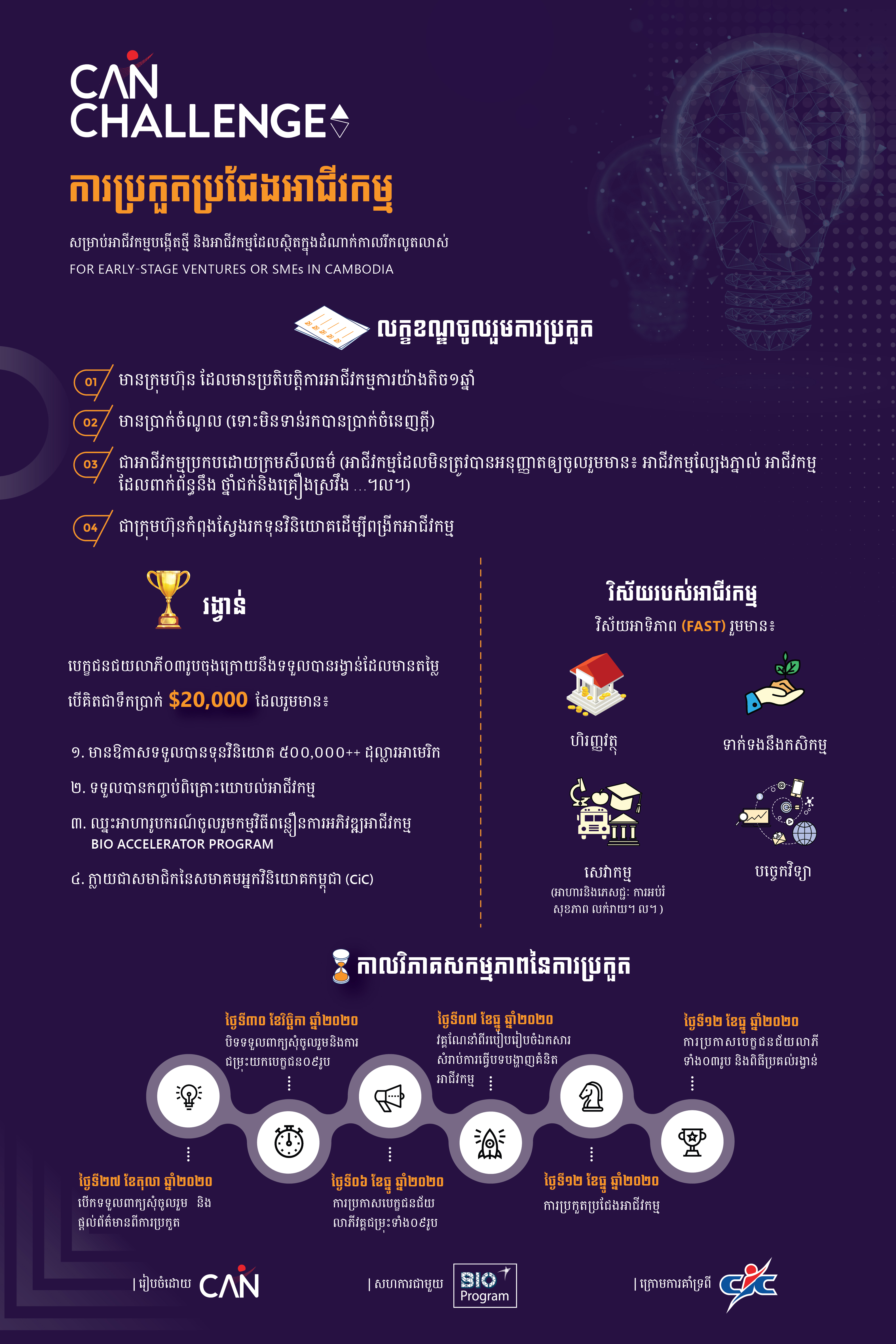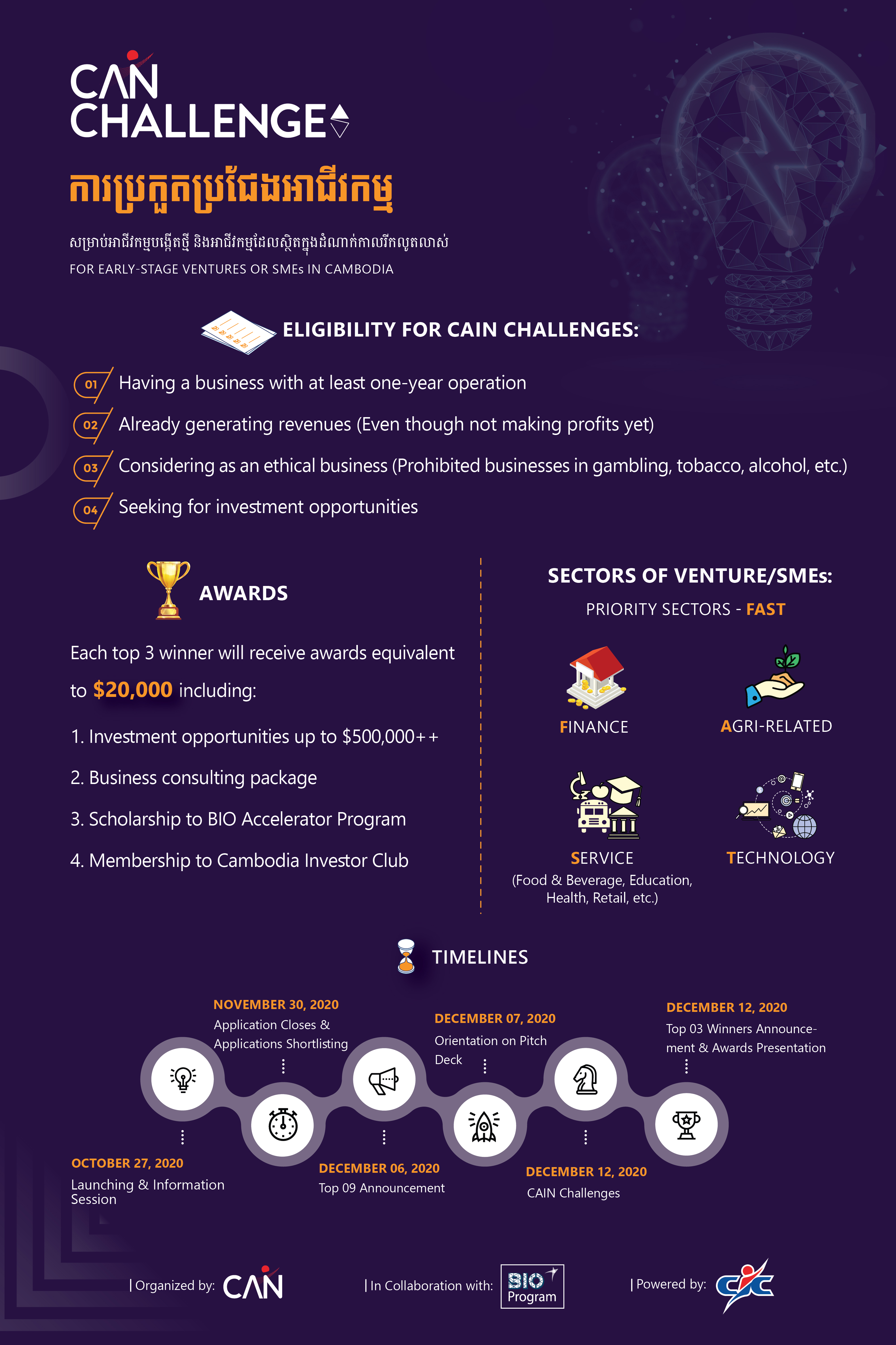 សម្រាប់អាជីវកម្មបង្កើតថ្មី និងអាជីវកម្មនៅក្នុងដំណាក់កាលរីកលូតលាស់នៅប្រទេសកម្ពុជាដែលចង់ពង្រឹងសមត្ថភាពគ្រប់គ្រងរបស់ពួកគេ ត្រូវការការពិភាក្សាយោបល់អាជីវកម្ម និងកំពុងស្វែងរកទុនវិនិយោគដើម្បីពង្រីកអាជីវកម្មរបស់ពួកគាត់ ការប្រកួតប្រជែងអាជីវកម្ម CAIN Challengesជាឱកាសពិសេសមិនគួររំលង។ចាប់ផ្តើមទទួលពាក្យចាប់ពីថ្ងៃនេះរហូតដល់ថ្ងៃទី ៣០ ខែវិច្ឆិកាឆ្នាំ ២០២០(មុនម៉ោង ១២យប់)។
