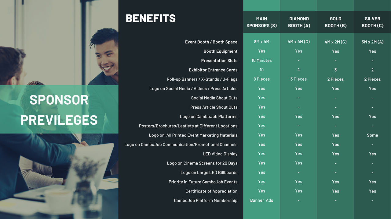 សម្រាប់ក្រុមហ៊ុនដែលមានចំណាប់អារម្មណ៍ក្នុងការកក់ស្តង់ CamboJob មានស្តង់៤ប្រភេទផ្សេងគ្នាសម្រាប់ថ្ងៃពិព័រណ៍ការងារដែលមានដូចជា៖ Main Sponsors (S), Diamond Booth (A), Gold Booth (B), Silver Booth (C) ។