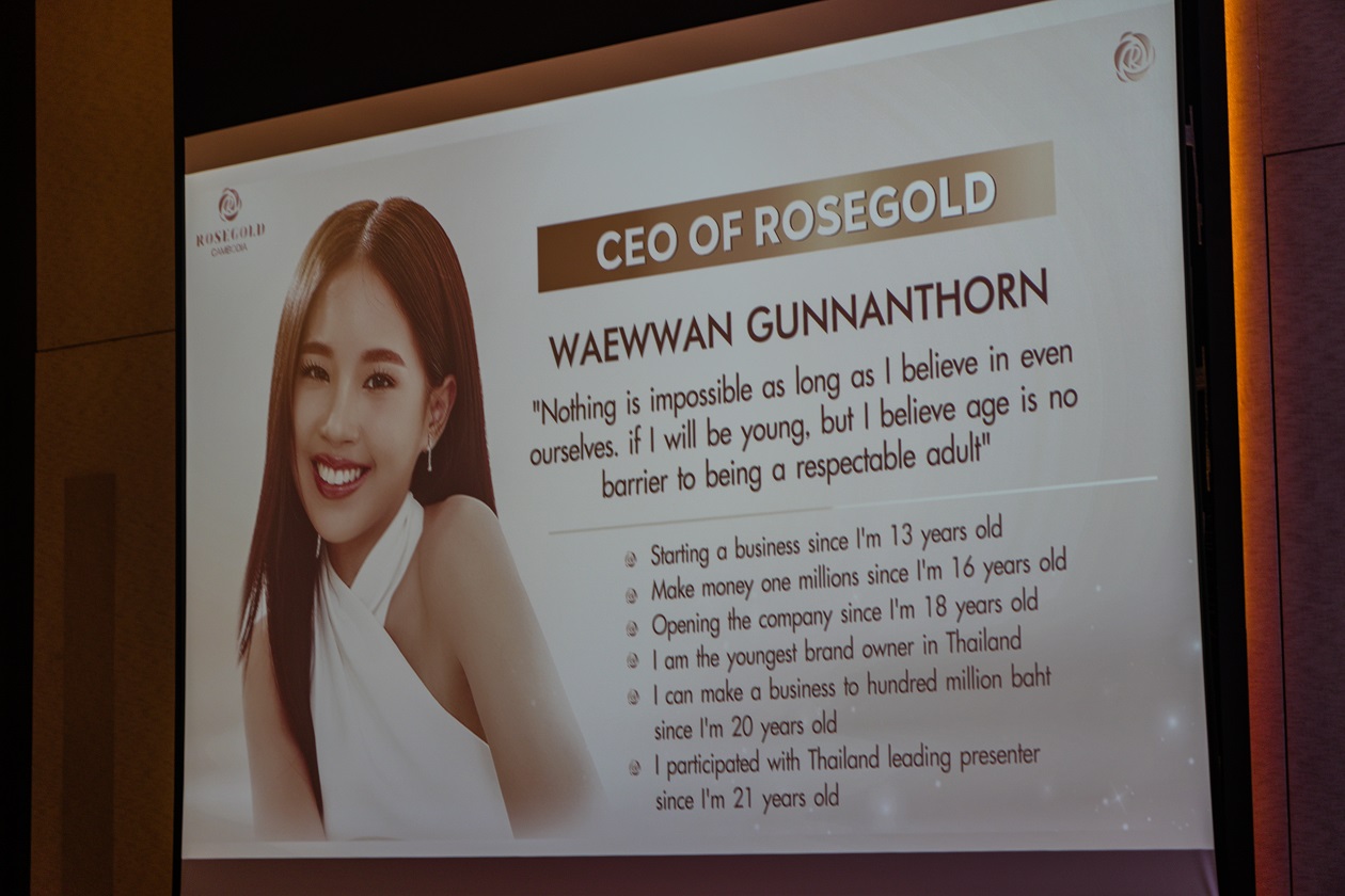 បន្ថែមពីនេះអ្នកស្រី Waewwan Gunnanthorn បានលើកឡើងថា គ្មានអ្វីដែលមិនអាចទៅរួចនោះទេប្រសិនណាបើ យើងមានជំនឿជាក់មកលើខ្លួនឯង។ មានប្រវត្តិចាប់ផ្ដើមអាជីវកម្មតាំងពីវ័យ 13 ឆ្នាំនាយិការរូបនេះបានប្រកាសថាខ្លួនបានរកចំណូលបានមួយលានដុល្លារតាំងពីវ័យ 16 ឆ្នាំមកម្លេះ។ នៅវ័យ 18 ឆ្នាំគាត់ក៏បានចាប់ផ្ដើមបើកអាជីវកម្មដំបូងហើយត្រូវបានចាត់ថ្នាក់ថា ជាម្ចាស់ប្រ៊ែន ស្ត្រីវ័យក្មេងជាងគេបំផុតនៅក្នុងប្រទេសថៃ។ តាមរយៈ សន្និសីទកាសែត នាយិការូបនេះបានប្រកាសថា អាជីវកម្មរបស់ខ្លួនអាចរកចំណូលបានរាប់រយលានបាត តាំងពីខ្លួននៅវ័យ 20 ឆ្នាំហើយក៏បានចូលរួមធ្វើជាវាគ្មិននៅប្រទេសថៃតាំងពីវ័យ ២១ឆ្នាំ។ នេះជាមូលហេតុដ៏ចម្បងមួយដែលធ្វើឲ្យគាត់ដឹកនាំនិងពង្រីកក្រុមហ៊ុន Rosegold ទៅកាន់បណ្ដាប្រទេសក្រៅពីប្រទេសថៃ។