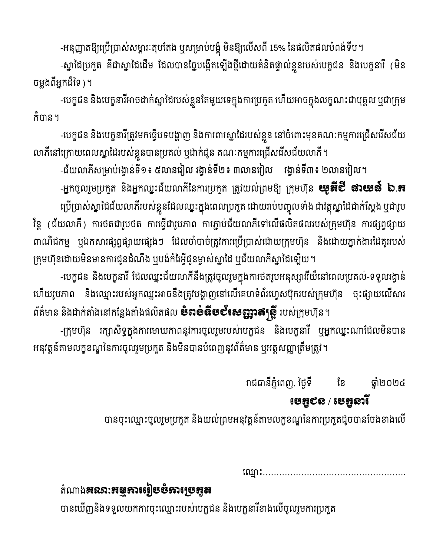 អ្នកស្រី សុច ច័ន្ទម៉ូលីណា តំណាងក្រុមហ៊ុន យូភីជី ផាយផ៍ ឯ.ក បានលើកឡើងដូច្នេះថា ការប្រកួតប្រជែងនេះមានគោលដៅសំខាន់គឺលើក កម្ពស់ស្នាដៃច្នៃប្រឌិតវត្ថុសិល្ប: ដោយប្រើប្រាស់បំពង់ទីបជ័រសញ្ញាឥន្ទ្រី ដោយការ ទទួលពាក្យប្រកាសចាប់ផ្ដើមតាំងពីថ្ងៃទី១៥ មិថុនារហូតដល់បំណាច់ខែកក្កដា។ បេក្ខជនជាសិស្សានុសិស្សនិងនិស្សិតមានពេល១ខែពេញពោលគឺពីថ្ងៃទី១សីហា រហូតដល់ថ្ងៃទី៣១ ខែសីហា ឆ្នាំ២០២៤ សម្រាប់ធ្វើការលើកិច្ចការរបស់ខ្លួន។ អ្នកស្រីបន្តទៀតថា ការប្រគល់ស្នាដៃជូនគណៈកម្មការជ្រើសរើសជ័យលាភីធ្វើឡើងពីថ្ងៃទី១ សីហា ដល់ថ្ងៃទី៣០ សីហា ហើយការប្រកាសលទ្ធផលធ្វើឡើងនៅថ្ងៃទី១២ ខែតុលា ឆ្នាំ២០២៤។
